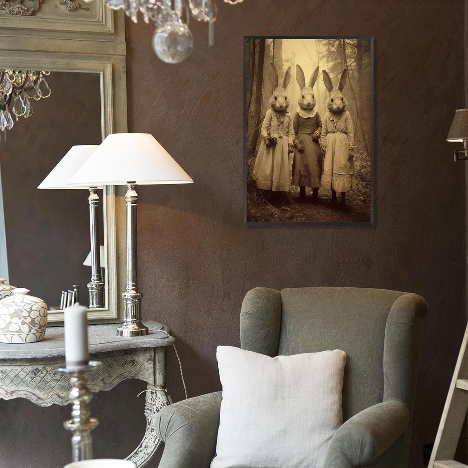 Vintage Horror Spooky Three Rabbits In Occult Forest Spooky Canvas Wall Art Poster Gothic Dark Academia Decorations Room Creepy Print Retro Halloween Wall Decor 16X24inch Aluminum Framed