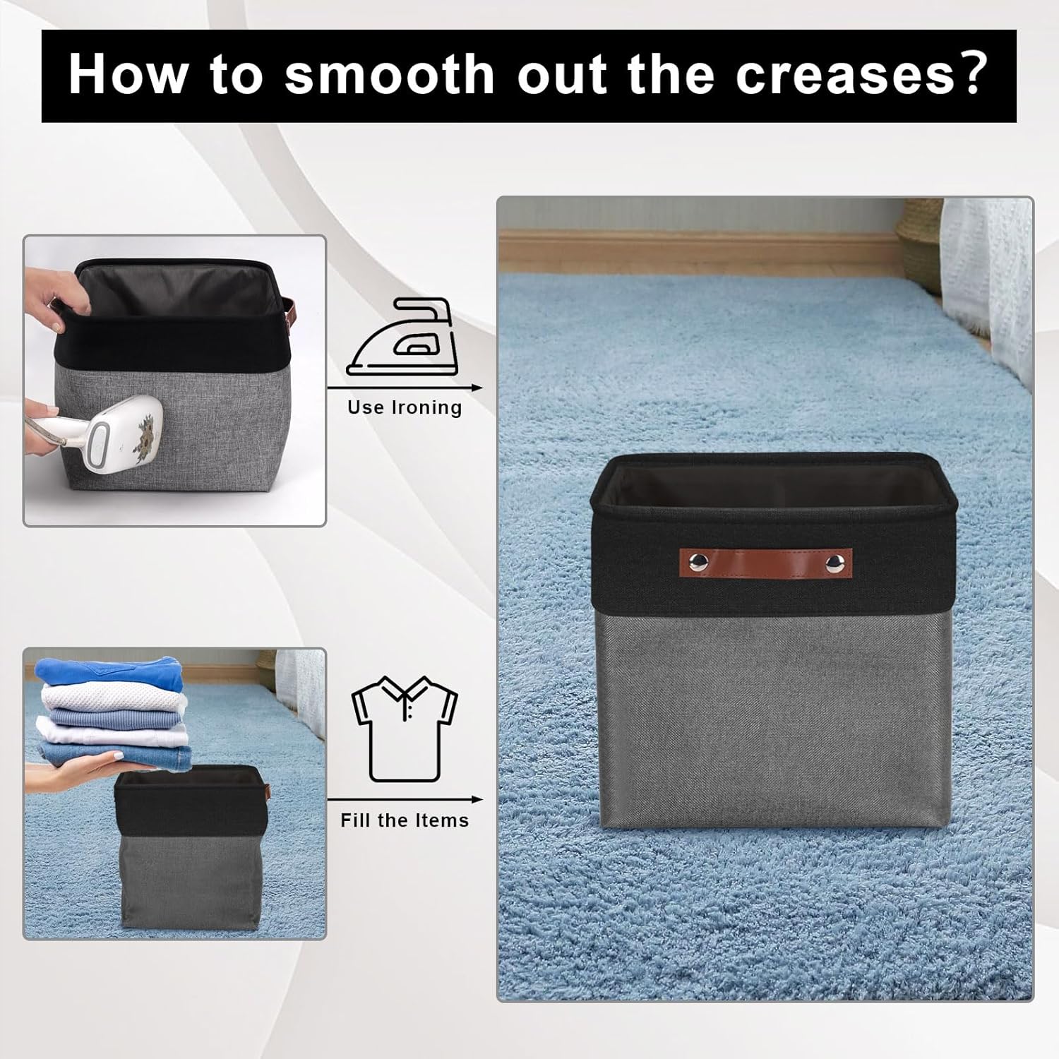 - 【Maintenance & Care Tip】 - Collapsible design for space saving. Our foldable baskets comes in a compression packing which may result in wrinkled storage bin during the long transit. Get rid of the wrinkles by either stuffing the fabric storage bins with blankets and pillows for a few days or steam iron them at low-heat setting. The organization baskets are easy to clean, you can dust the basket with a soft cloth with light soapy water when needed. Not recommended to machine wash.