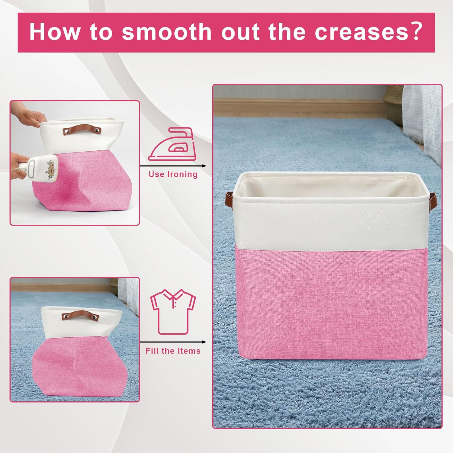 - 【Maintenance & Care Tip】 - Collapsible design for space saving. Our foldable baskets comes in a compression packing which may result in wrinkled storage bin during the long transit. Get rid of the wrinkles by either stuffing the fabric storage bins with blankets and pillows for a few days or steam iron them at low-heat setting. The organization baskets are easy to clean, you can dust the basket with a soft cloth with light soapy water when needed.