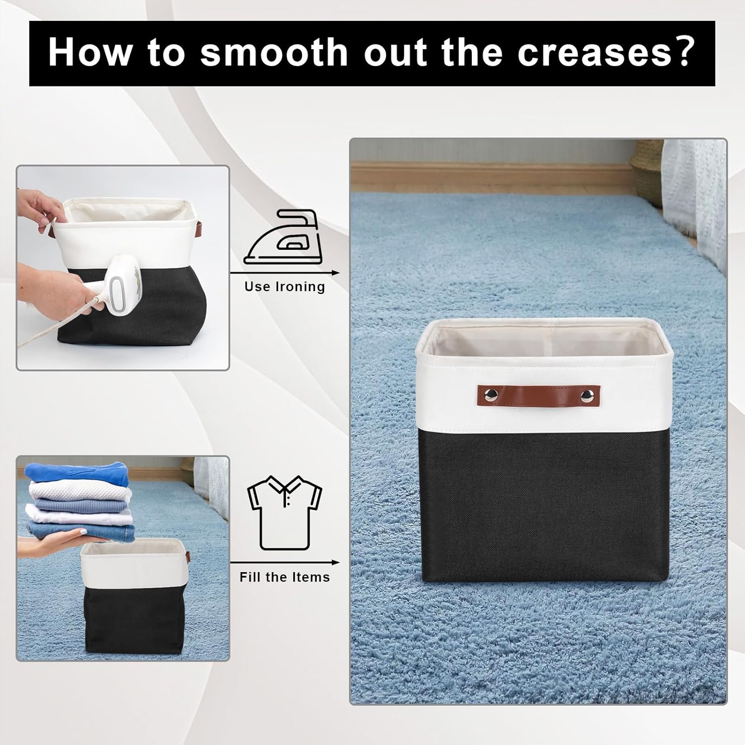 - 【Maintenance & Care Tip】 - Collapsible design for space saving. Our foldable baskets comes in a compression packing which may result in wrinkled storage bin during the long transit. Get rid of the wrinkles by either stuffing the fabric storage bins with blankets and pillows for a few days or steam iron them at low-heat setting. The organization baskets are easy to clean, you can dust the basket with a soft cloth with light soapy water when needed. Not recommended to machine wash.