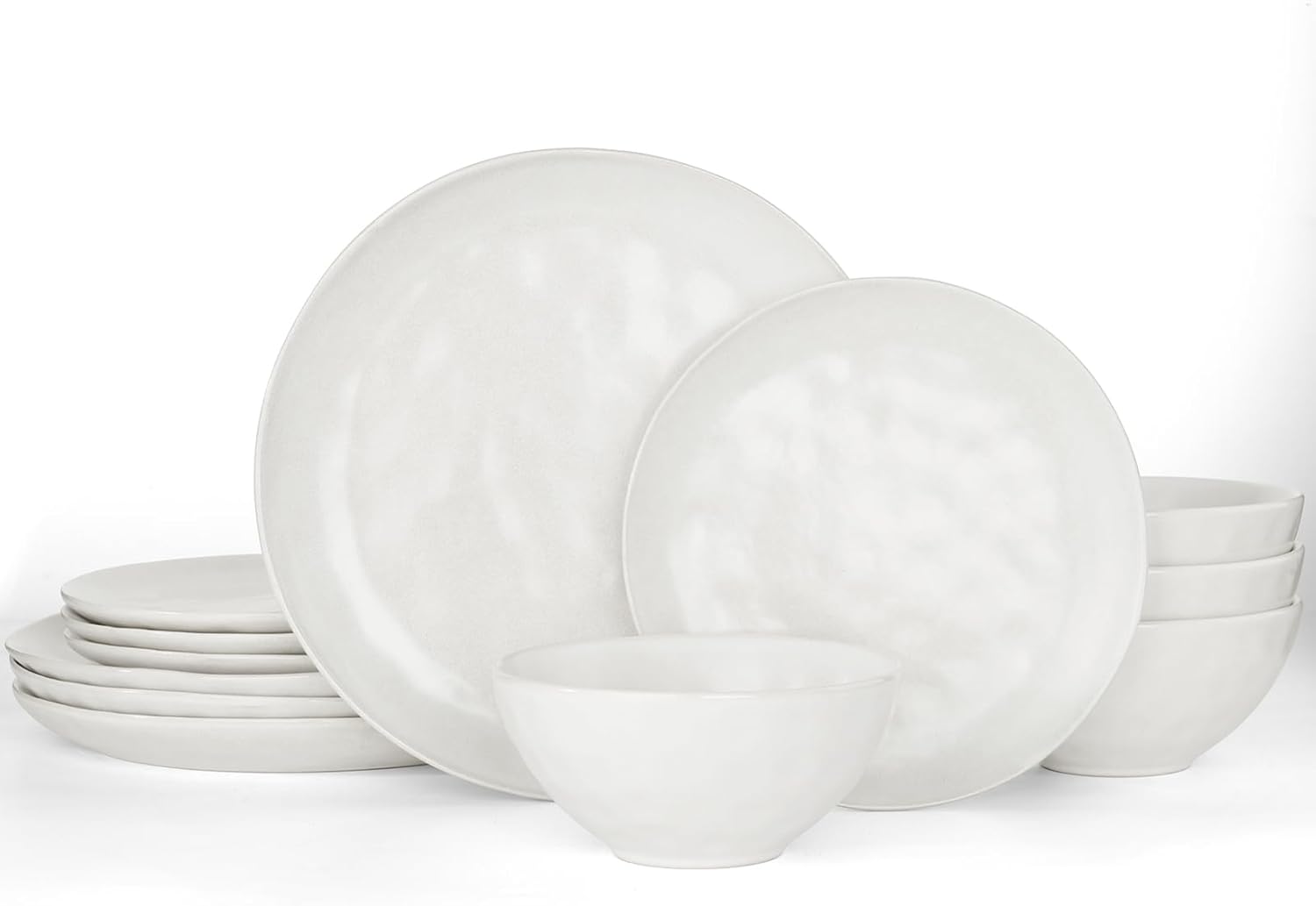 Famiware Dinnerware Sets for 4, Ocean Round 12-Piece Kitchen Plates and Bowls Sets, Microwave and Dishwasher Safe, Scratch Resistant, Matte White