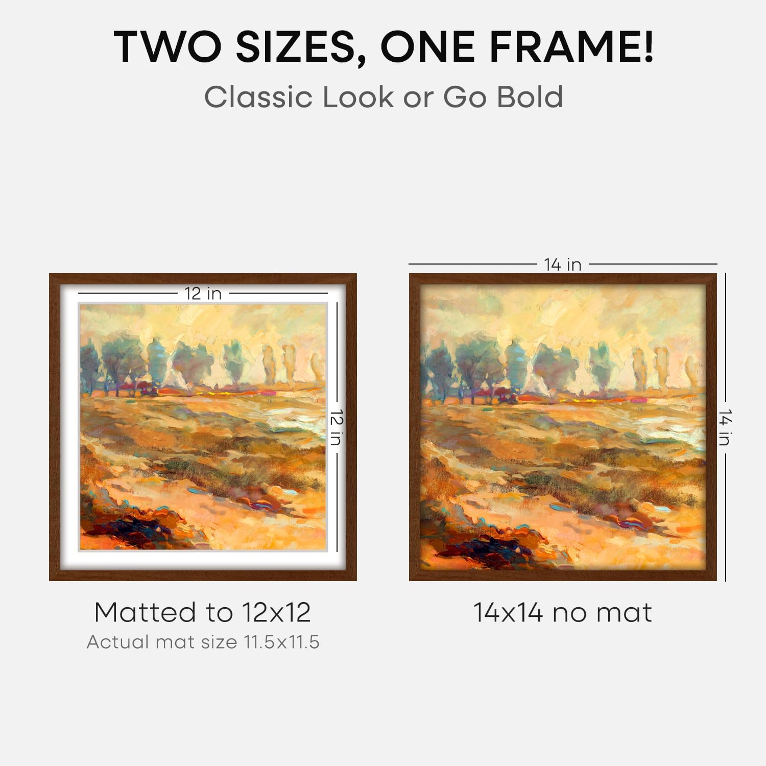 Homeforia 14x14 Picture Frame Brown, High End Dark Oak 14 x 14 Square Wood Frame with Mat 12 x 12 for Photo, 14by14 Wooden Walnut Poster Frame Matted to 12x12 Print, Tempered Glass, Wall Kit, Set of 1