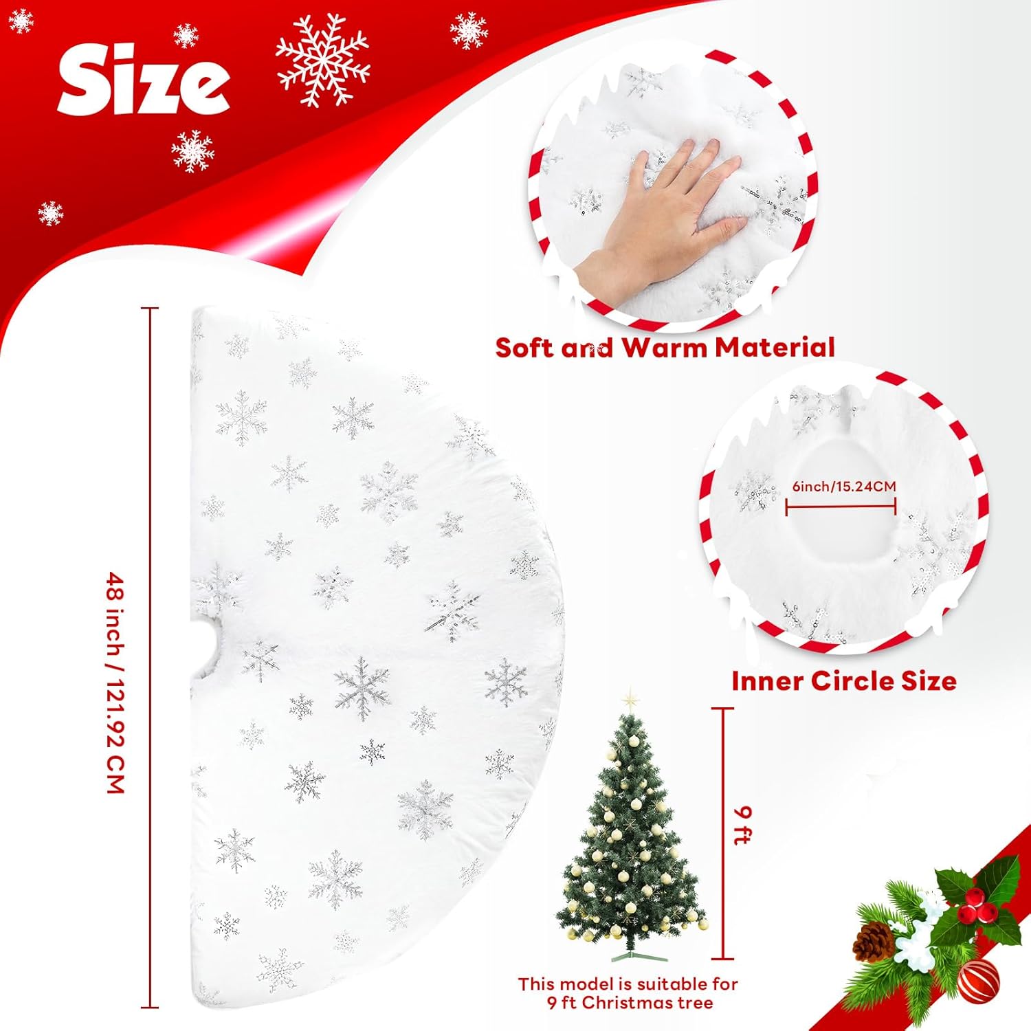 - 🎄【Sparkling Silver Sequins】Adorned with shimmering silver sequins, this tree skirt sparkles and shines, creating a festive and magical ambience around your Christmas tree. The silver accents enhance the overall beauty of your holiday decorations.