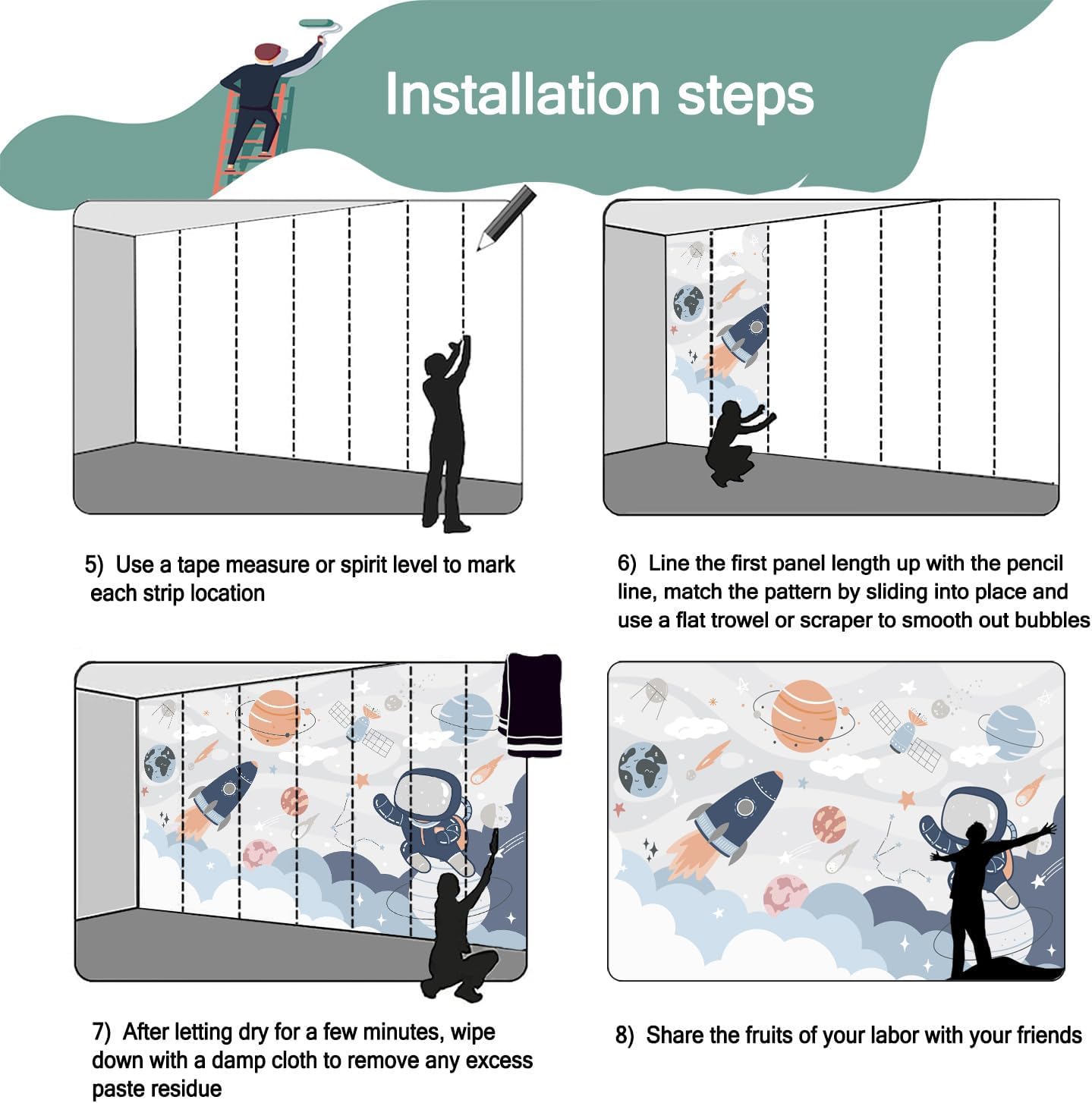 - Mural wallpaper size: 100 "W x 65 "H, divided into 5 sections, each section is labeled with a number underneath, there is no need to overlap the pattern when installing, just install according to the number labeled underneath the panel