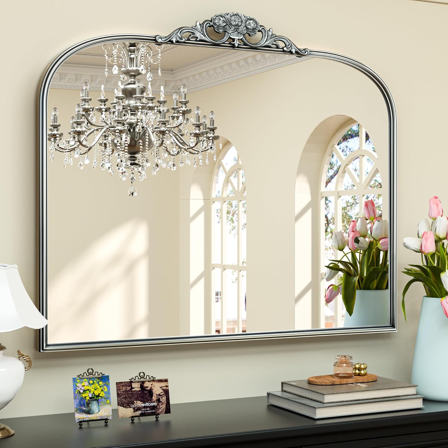 Keonjinn Vintage Mirror for Wall, 40" x 30" Silver Mirror with Metal Frame, Ornate Arched Decoration, Brass Mirror for Mantle, Living Room, French Cleat Mounting