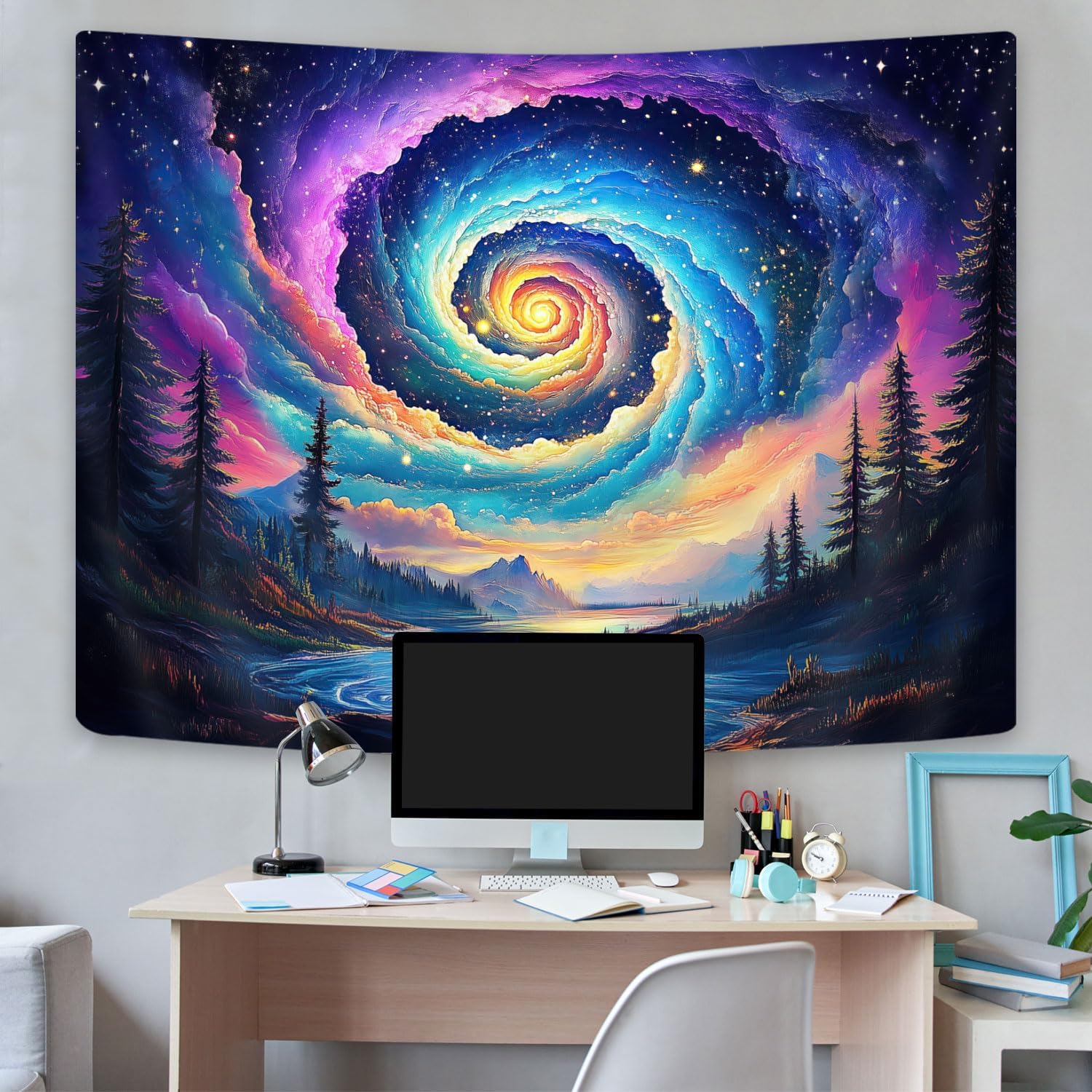 Galaxy Space Tapestry, Cool Colorful Trippy Forest Mountain River Aesthetic Tapestries, Psychedelic Starry Sky Swirls Misty Fantasy Landscape Tapestry Wall Hanging College Bedroom for Guys Men 60X40