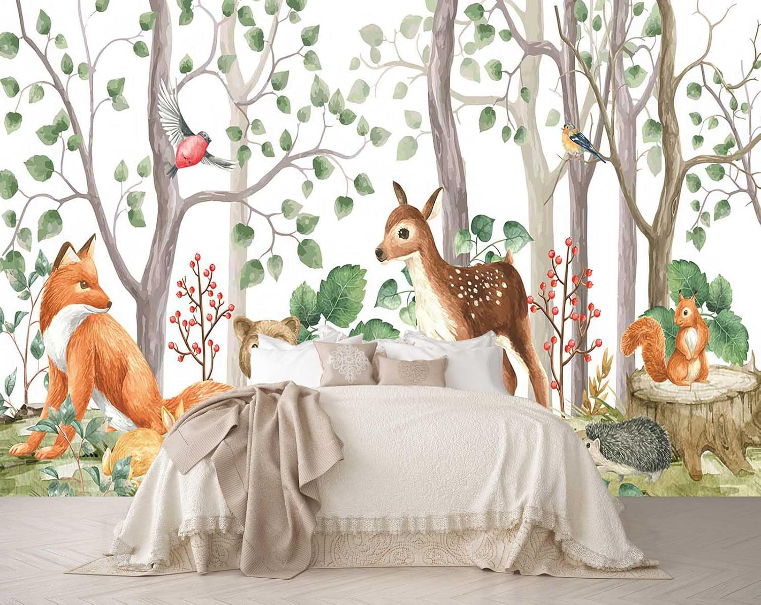 Cute Forest Animals Green Plants Trees Grasslands Composition Watercolor Mural for Interior Wall Decoration(Not Peel and Stick)