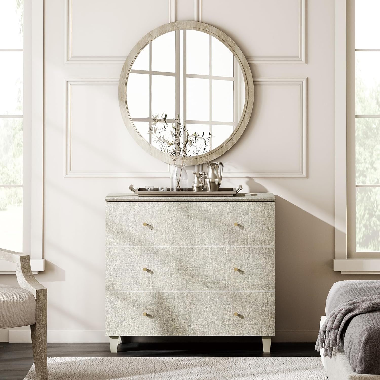 - Modern Stylish Storage Organizing Unit: Wooden chest of drawer with classic gold pull knobs. The beige faux linen-textured finish paired with smooth finish solid legs combines modern elegance to add character and charm to your bedroom, bayby room and living room. It's a simple and striking combination for those who love modern style