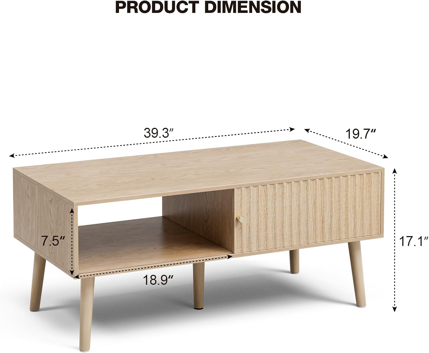 Coffee Table with Storage, Boho Dining Table with Sliding Fluted Door and Solid Wood Legs, Small Coffee Tables for Living Room, Oak