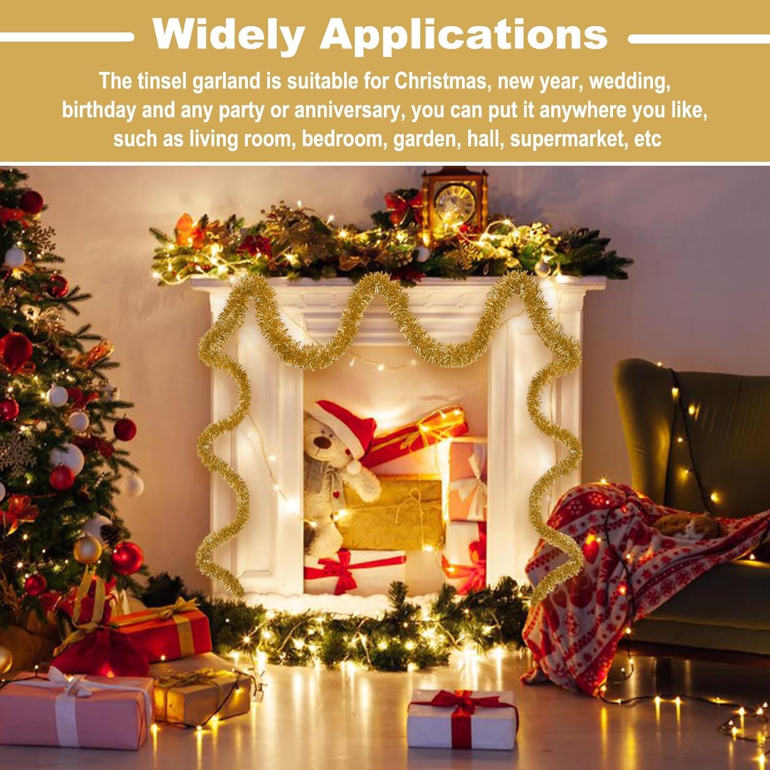 - Wide Application: Suitable for all kinds of special days, such as christmas, new year, valentine's day, halloween, festivals, wedding, engagement, bridal baby shower, graduation celebrations. The tinsel garland are perfect decorations for party, home decorations, parade float, garden, christmas tree, christmas wreath, wall, ceiling, door, hedge, stair rail, doorway, window, pole, table and so on