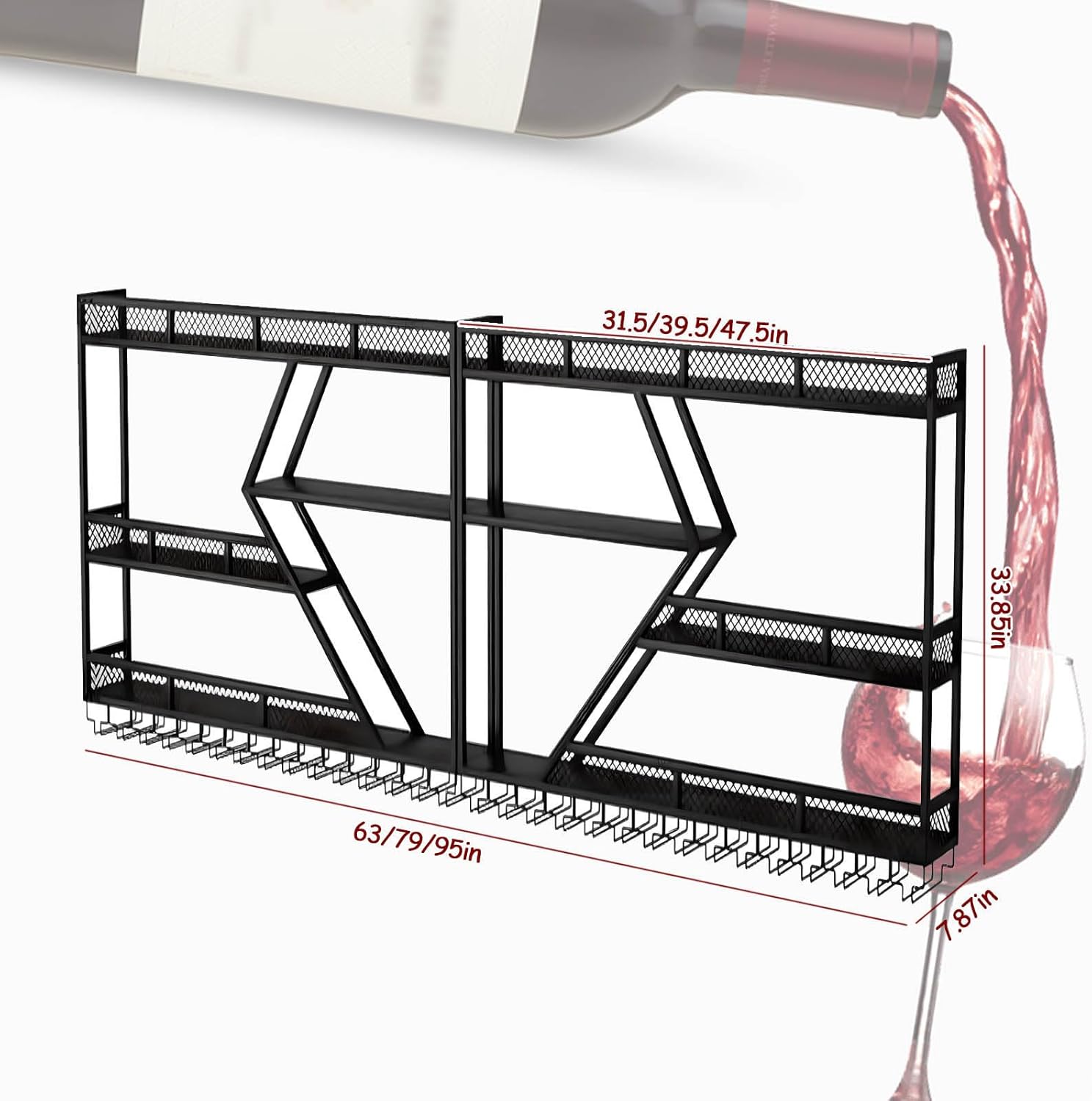 Wall Mounted Wine Rack with Glass Holder, 3-Tier Metal Storage Shelf, Black Diamond Design, Wine Bottle Display with Stemware Storage (Black, 47.24in/Right)