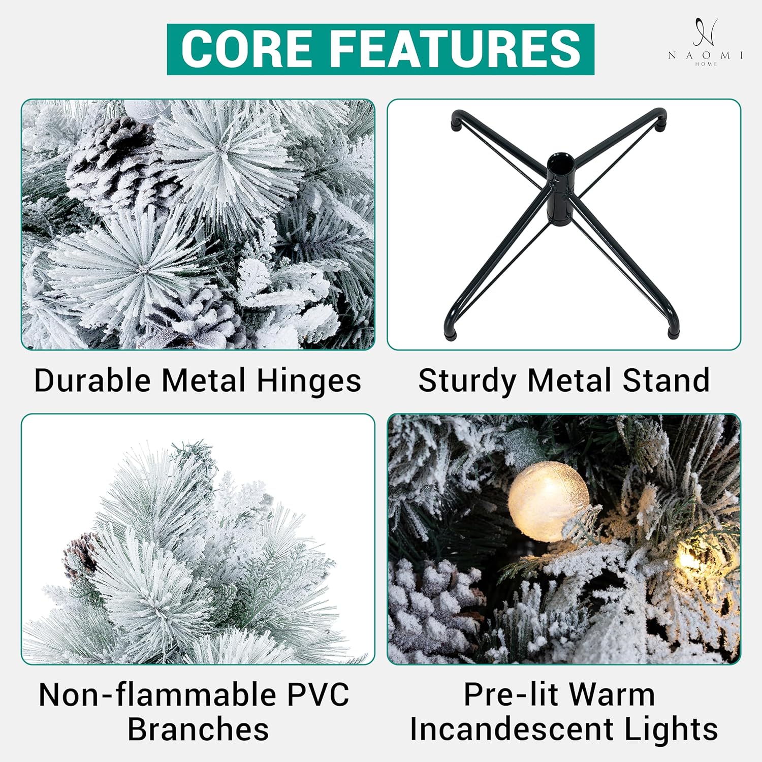 - LOOKS REALISTIC & FULL : Our 9 feet Pre Lit Christmas Tree comes with 1612 branch tips, 720 warm lights, and has a girth of 58 inches, which are unmatched for a 9ft White Christmas tree. So with the Naomi Home Artificial Christmas Tree, you will be bringing home the most realistic & full Frosted Christmas Tree that you can get.