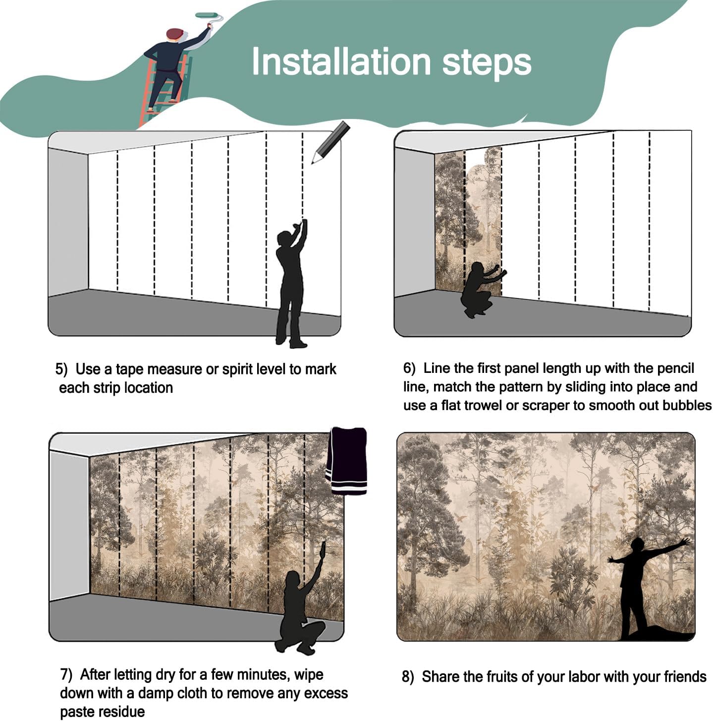 - Mural wallpaper size: 100 "W x 65 "H, divided into 5 sections, each section is labeled with a number underneath, there is no need to overlap the pattern when installing, just install according to the number labeled underneath the panel