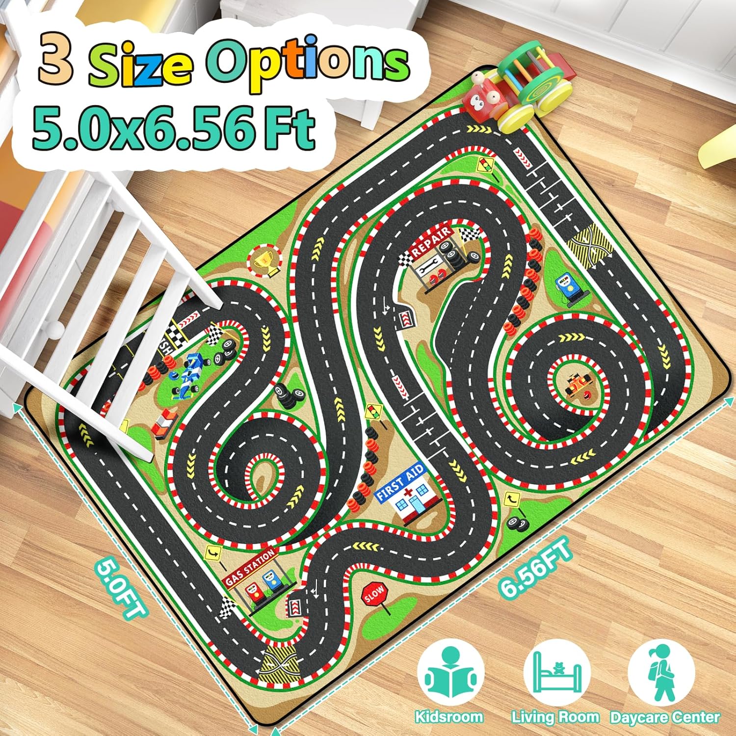 - [Unique Design]: This race track rug features a realistic 3D cascading surround route, complete with a start, and Finish line markings. The car rug is perfect for kids who enjoy playing with race cars. The vibrant colors enhance indoor play, creating an exciting outdoor experience at home.