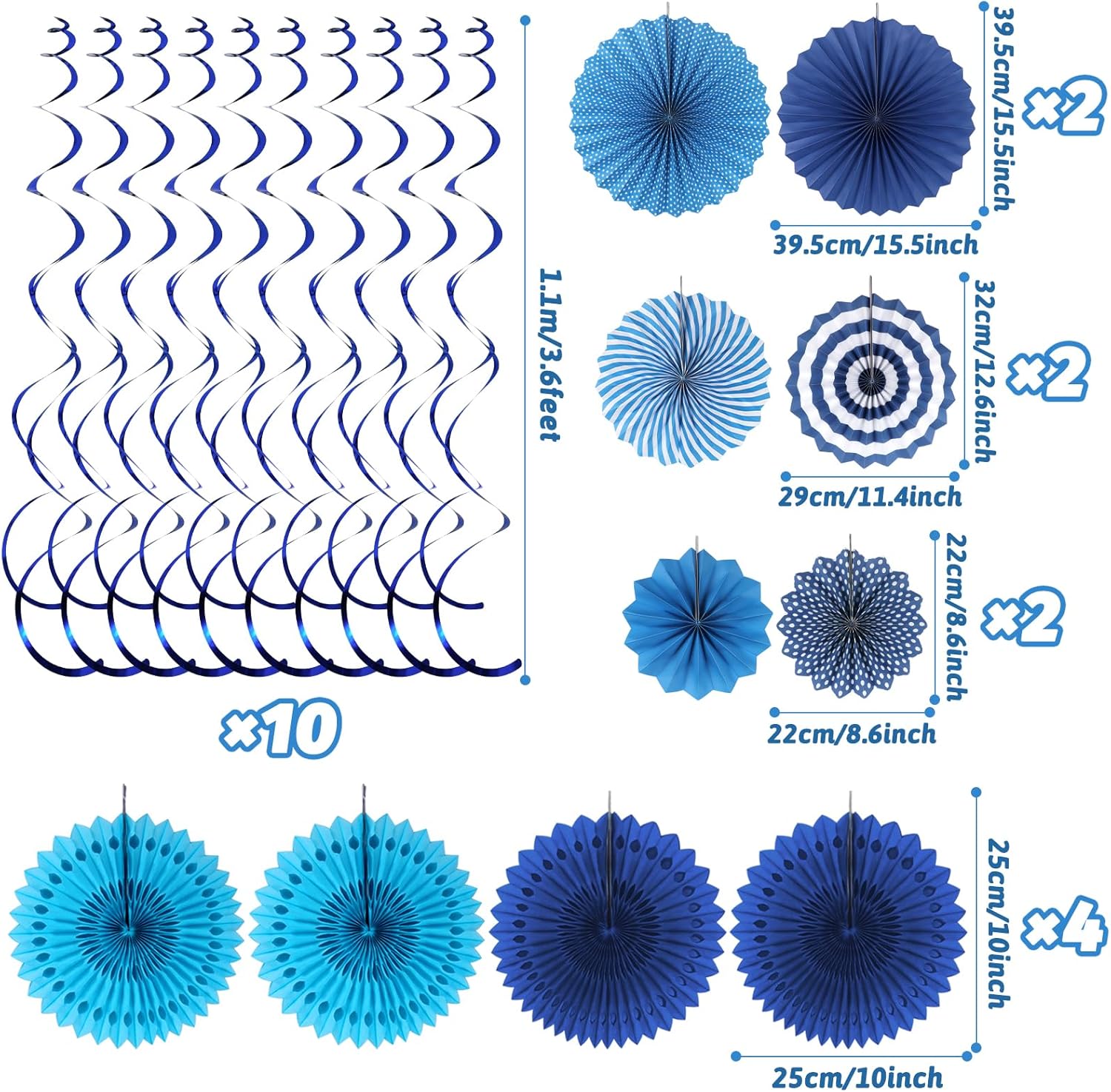- 【What you will get】6 x Paper Fan, 4 x Paper Honeycomb Ball , 4 x Paper Hollow Fan, 10 x Hanging Swirl, 1 x Paper Hot Air Balloon Garland,1 x Triangular Pennant Garland, 1 x Circle Paper Garland. ( Color: Blue)