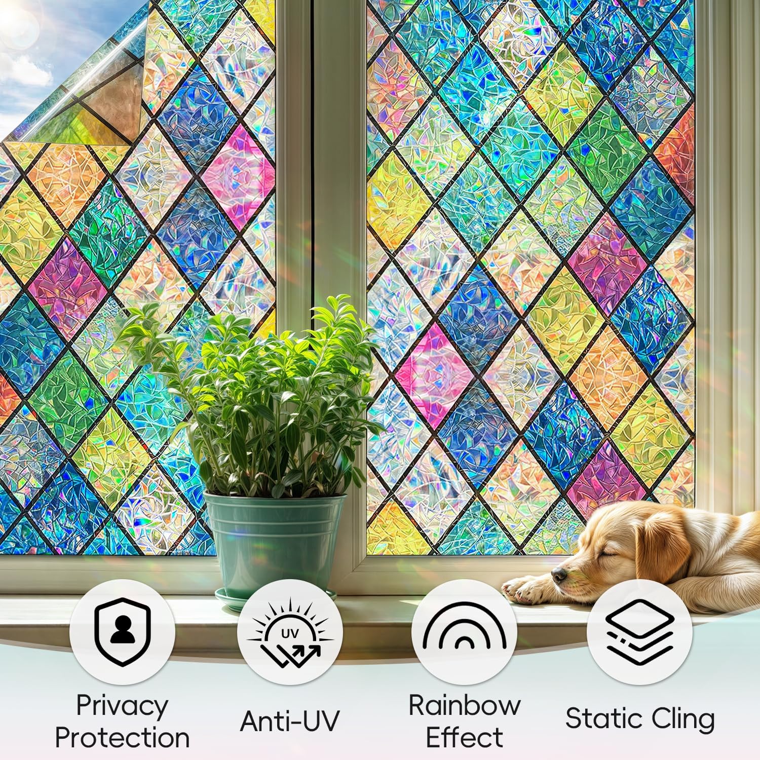 DUOFIRE Stained Glass Window Film Decorative Window Privacy Film Rainbow Diamond Grid Colorful Lattice Windows Cling Anti UV Static Cling Reusable Windows Decal for Home 11.8×39.3 inch