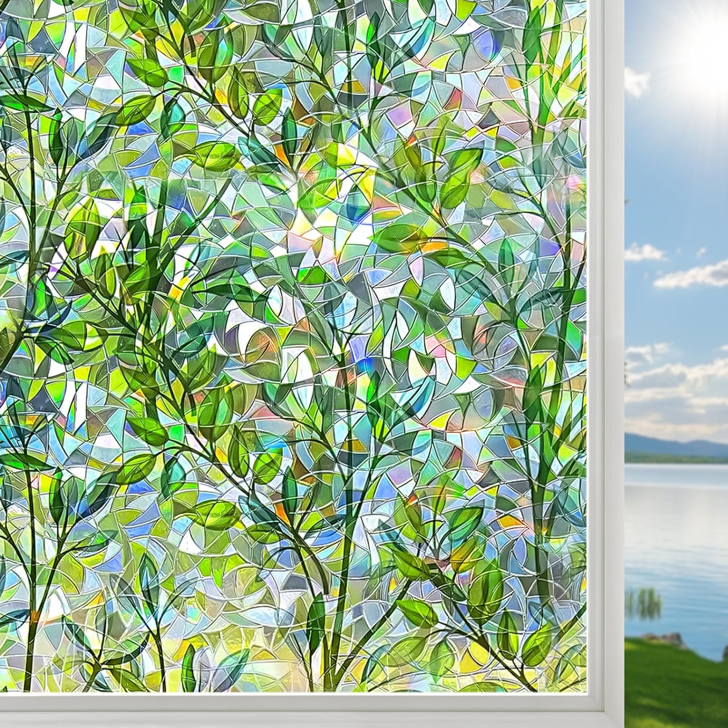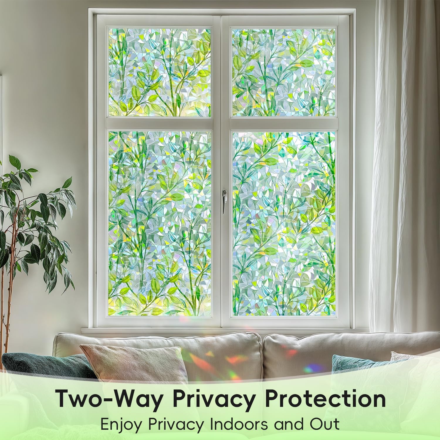 - Charming Visual Effect: When sunlight passes through this colorful stained glass window film, the window displays a mesmerizing rainbow effect, adding a decorative touch to your space. The green leaf pattern radiates a fresh, natural vibe under the light, combining with the rainbow glow to create a stunning visual experience that enhances the beauty and style of your space