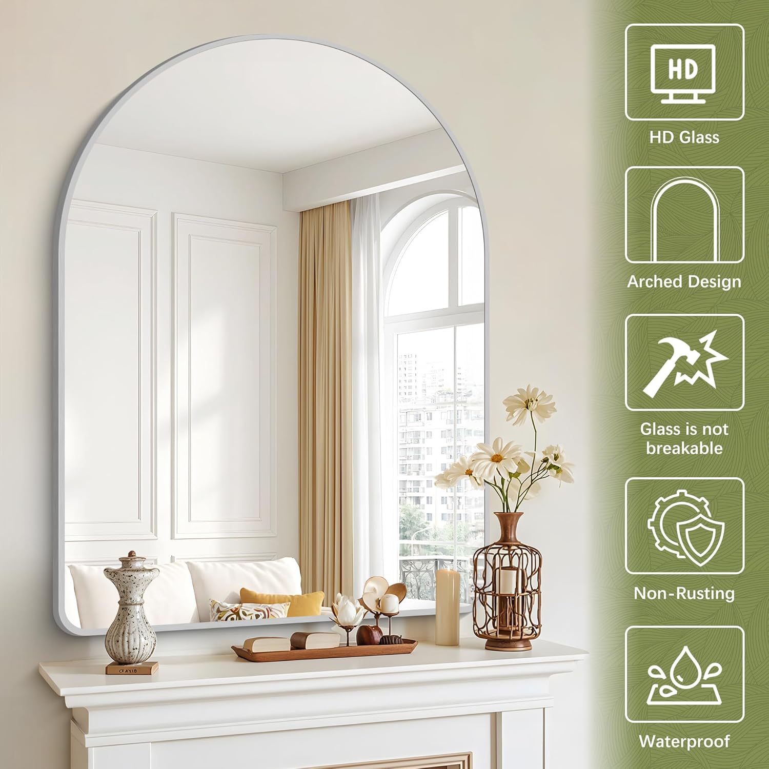 - HD Explosion-proof Glass: GLASHOM arch mirrors for wall is made of premium explosion-proof membrane glass so that it's safer for you and your family.Aluminum alloy frame which is anti-rust, and also the metal-framed mirror is with explosion-proof membrane built-in which ensure the mirror being safely and securely for using. The wall-mounted mirror for the bathroom performs beautifully in every climate.