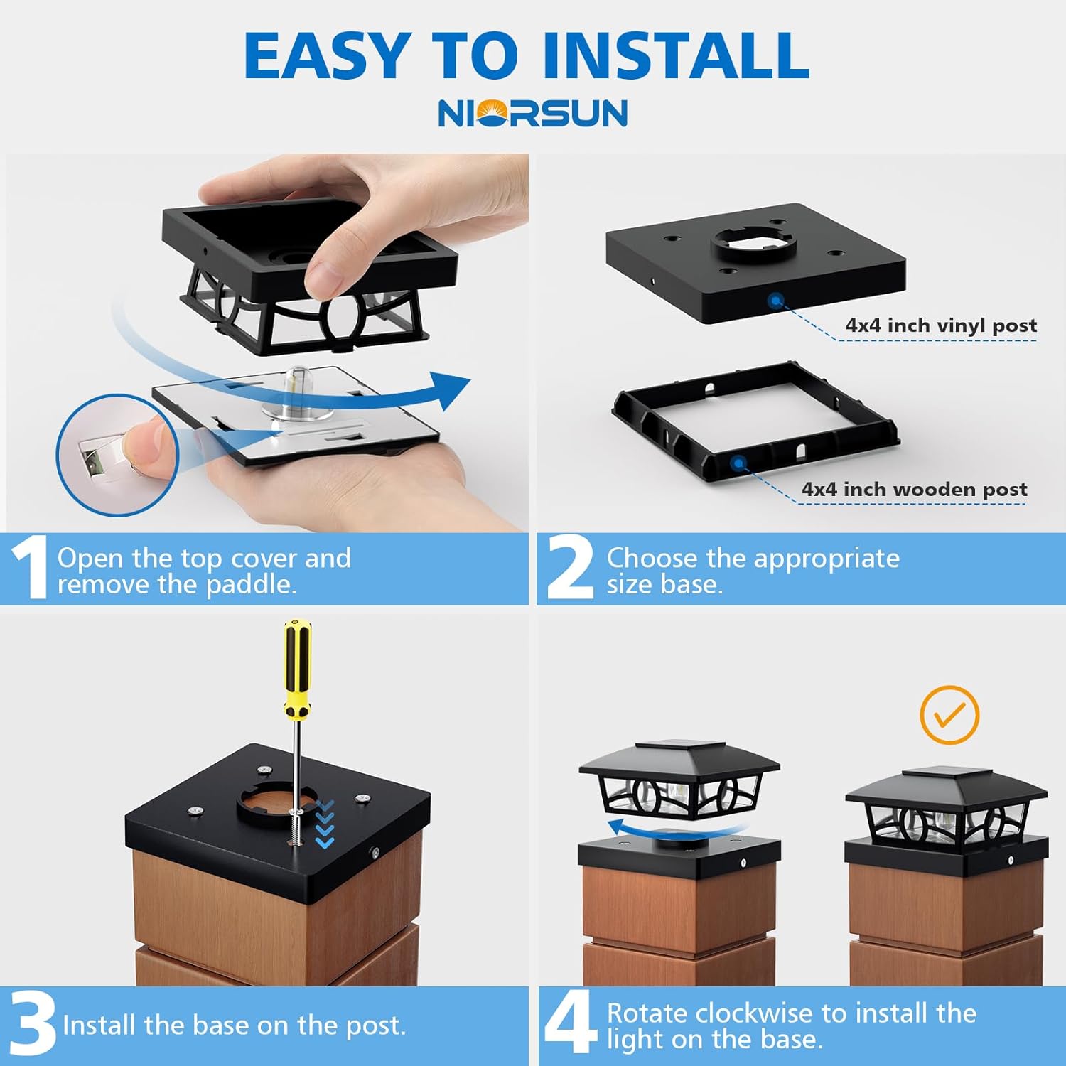 - Applicable Size & Easy Installation: NIORSUN 4x4 solar post cap lights are designed with different sizes of bases, making them compatible with standard 3.5x3.5 and 4x4 wood or vinyl posts. These solar deck post lights offer a hassle-free installation—no wiring required. Simply mount the solar post lights using the included mounting screws on your fence post caps