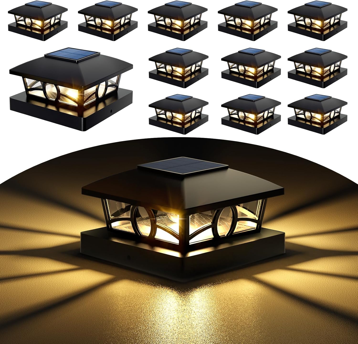 NIORSUN Solar Post Lights Outdoor, Fence Post Solar Lights Warm White Outdoor Waterproof Edison LED Bulbs Garden Patio Fence Deck Decor, 4x4 Post Caps Wood Vinyl, Black 12 Pack