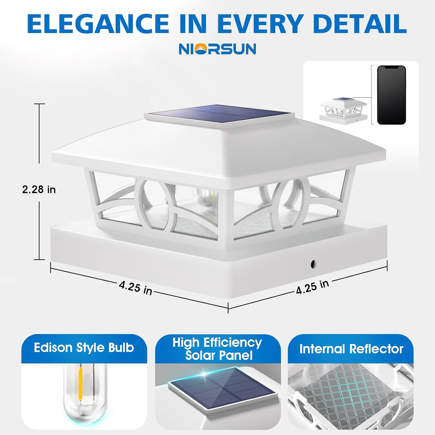 - Edison Bulbs with Warm Light: NIORSUN solar post cap lights outdoor effortlessly combine the classic appeal of Edison-style LED bulbs with the energy-efficient benefits of solar power. These fence post solar lights bring a touch of vintage charm to your outdoor space, casting a warm, golden glow. The soft, ambient light creates a cozy and inviting atmosphere, ideal for relaxing or entertaining guests in your garden or patio