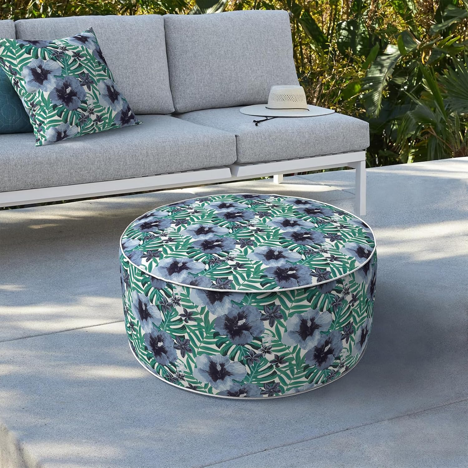 LVTXIII Indoor/Outdoor Inflatable Ottoman, D31 x H14 Inch Large Round Ottoman, All Weather Foot Rest Stool, Portable Footrest for Patio, Garden, Camping and Home - Blue Salmone Tropical