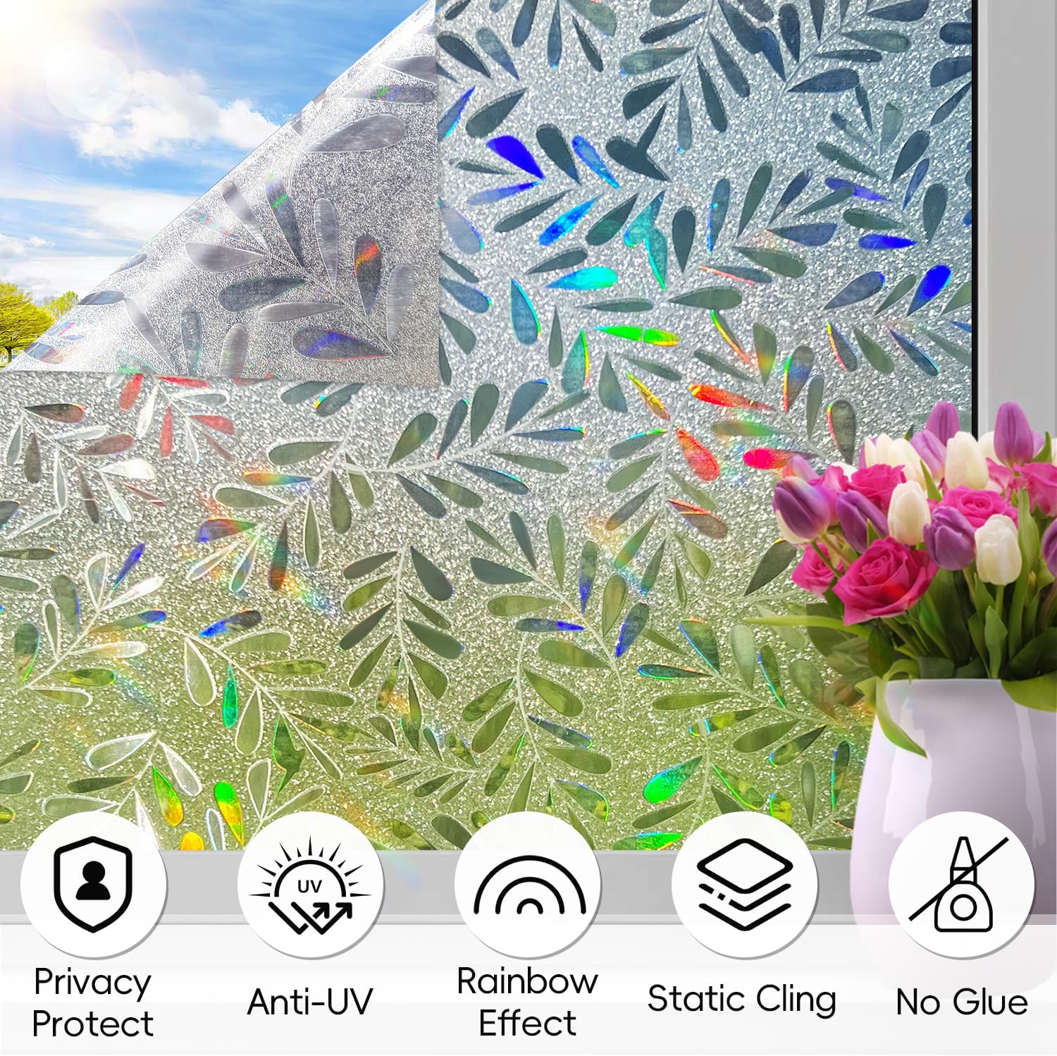 - Vibrant Visual Effects: When sunlight passes through the privacy window film, it creates a captivating rainbow effect. The leaf pattern, illuminated by daylight, displays dazzling colors that add a unique decorative touch. The shifting rainbow light enhances the aesthetics and style of your interior with a charming visual appeal. The base of the window film is a coarse, shiny frosted film, with the rainbow effect only on the leaf pattern