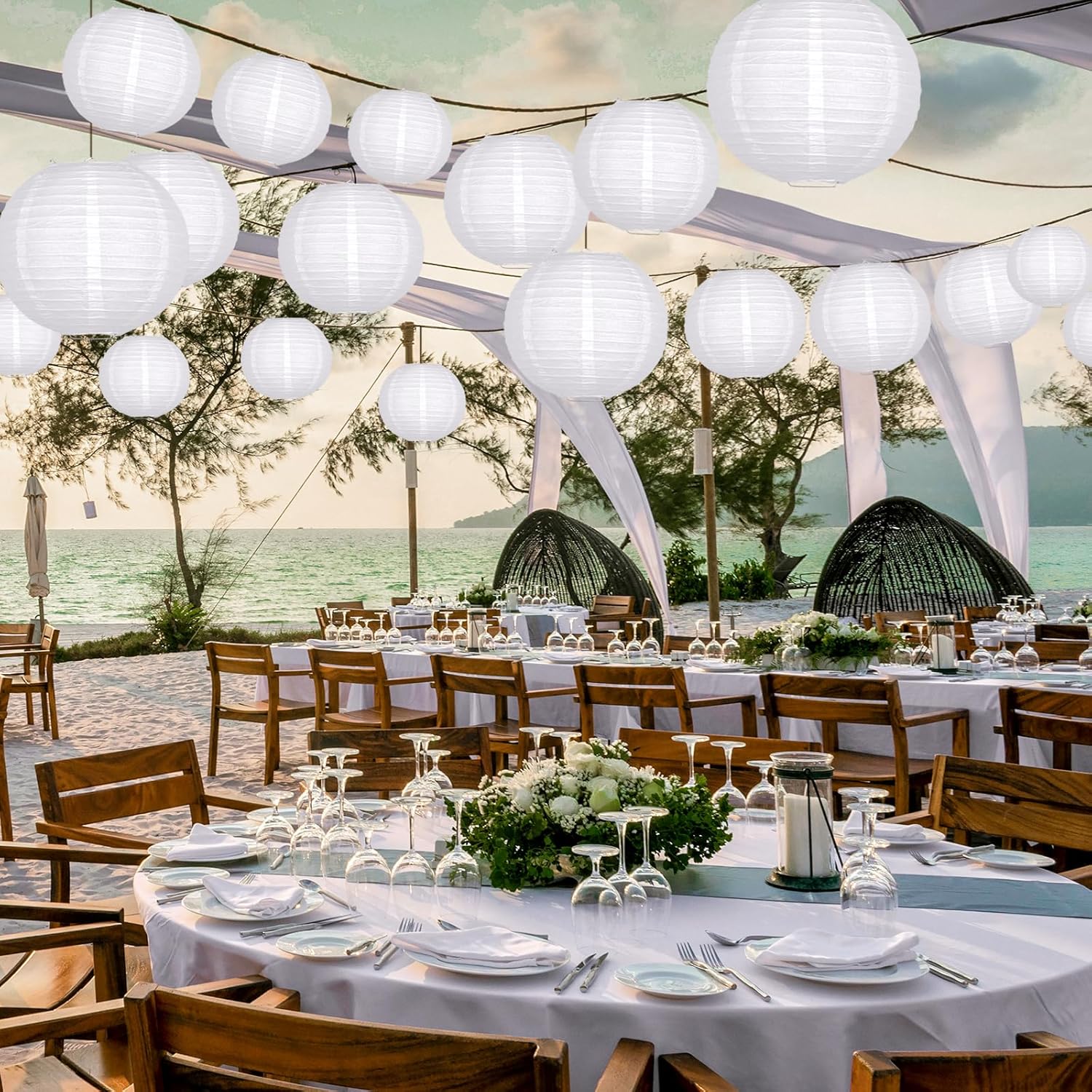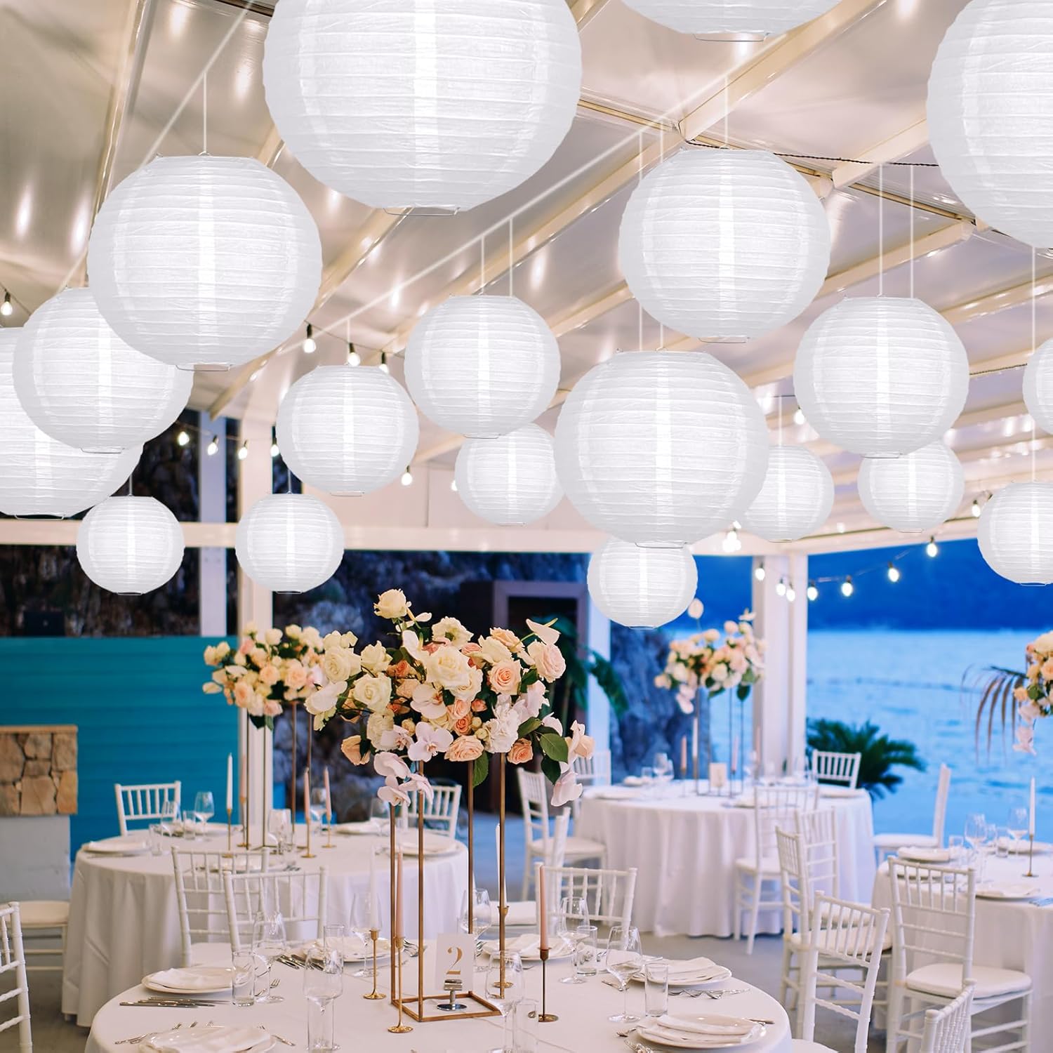 - PAPER LANTERNS SETS CONTENT - The white paper lantern set contains 21 paper lanterns that can be hung at your party. You will receive 6 pcs of 4 Inch Lanterns, 6 pcs of 6 Inch Lanterns, 6 pcs of 8 Inch Lanterns, 3 pcs of 10 Inch Lanterns. These white paper lanterns provide a variety of creative visual effects for your themed parties and weddings. A pack of 21 white lanterns are enough to decorate your event space and make it truly memorable