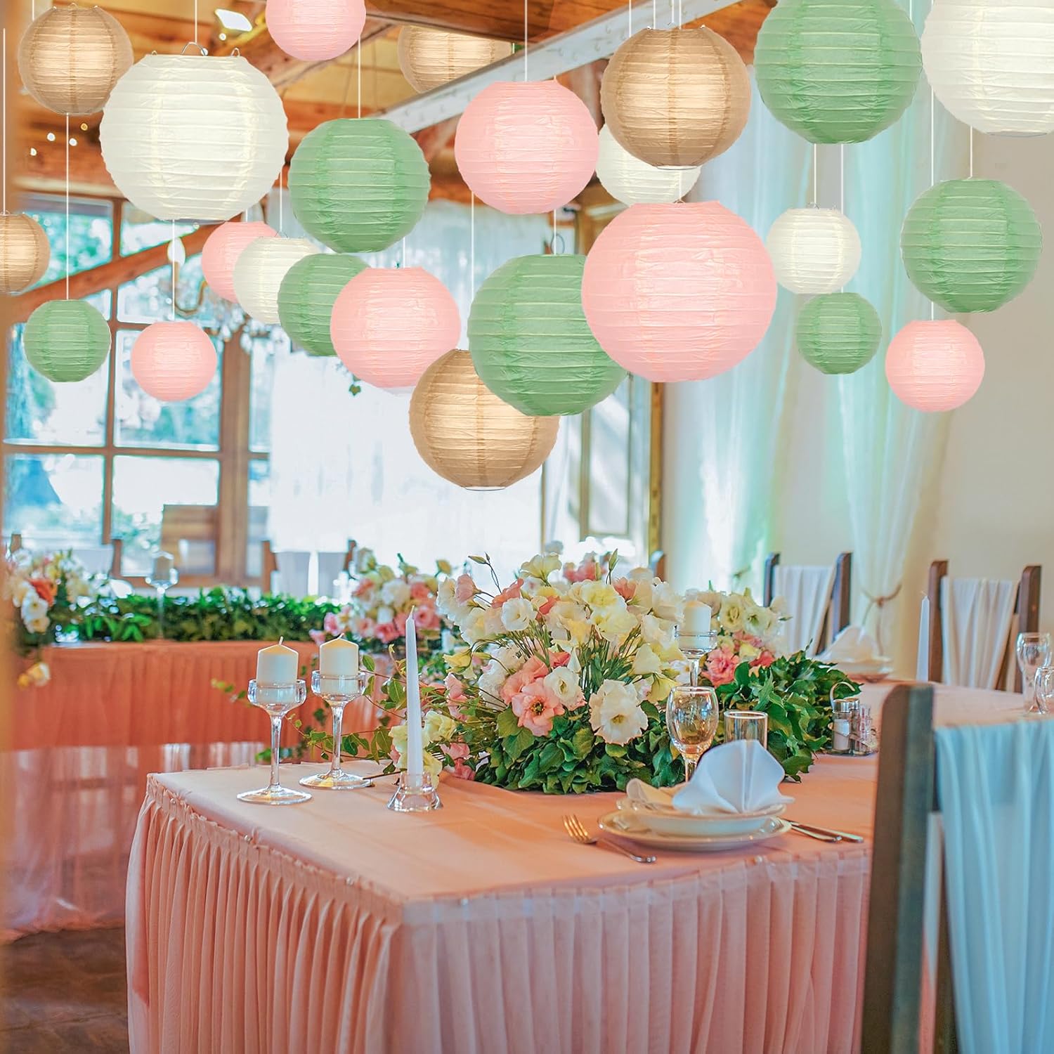 - PAPER LANTERNS SETS CONTENT - 4 Assorted sage green, pink, white, brown paper lantern value combination pack of 21 pieces assorted size ranging from Small to X-Large. You will receive 6 pcs of 4 Inch Lanterns, 6 pcs of 6 Inch Lanterns, 6 pcs of 8 Inch Lanterns, 3 pcs of 10 Inch Lanterns. These paper lanterns bringing a variety of creative visual effects to your theme parties and weddings. You can choose the corresponding color combination according to the theme of the party or wedding, or mix and match paper lanterns of different colors to create a unique and personalized decorative effect