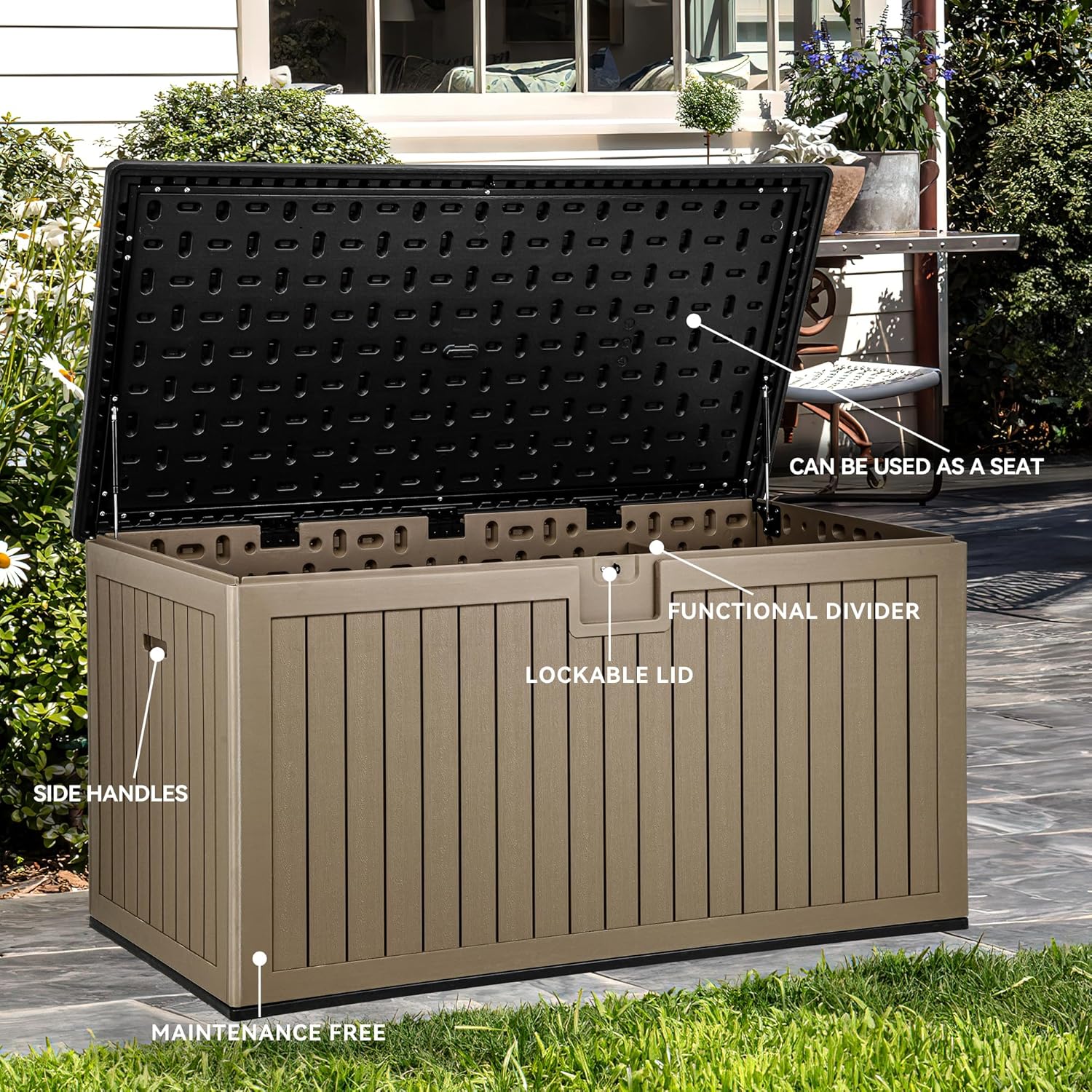 - Double-layer Structure: This deck box features a double-layer design that maximizes durability and strength, while the wood grain texture complements any decor; Made from weatherproof resin that’s rust-resistant, corrosion-resistant, and maintenance-free