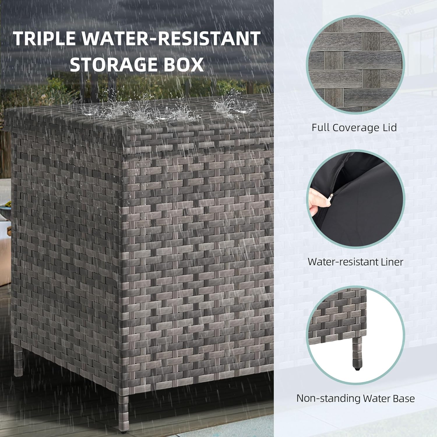 - Ultra Water Protection: This robust wicker deck box includes a zippered polyester bag and elevated legs, keeping belongings dry and secure from rain and water seepage. Ideal for outdoor storage.