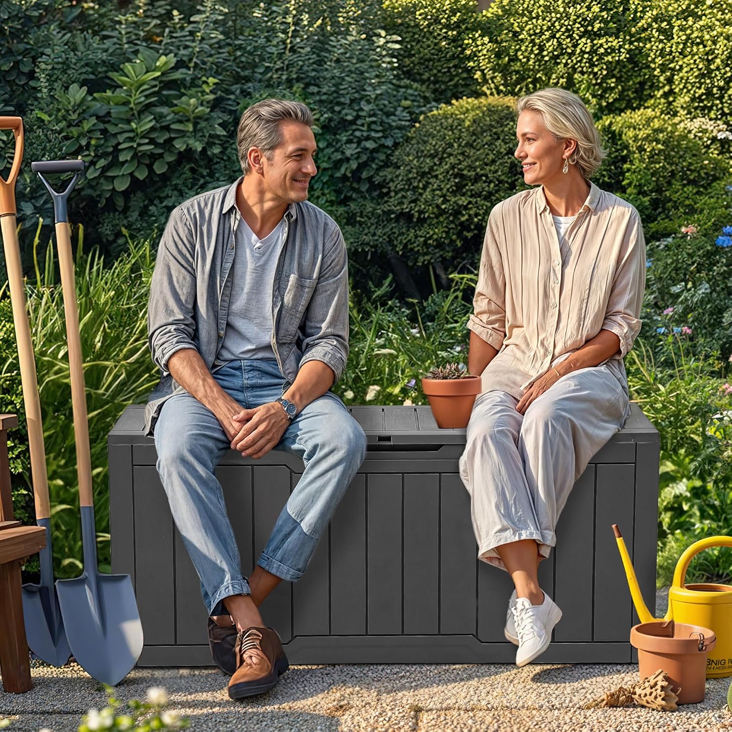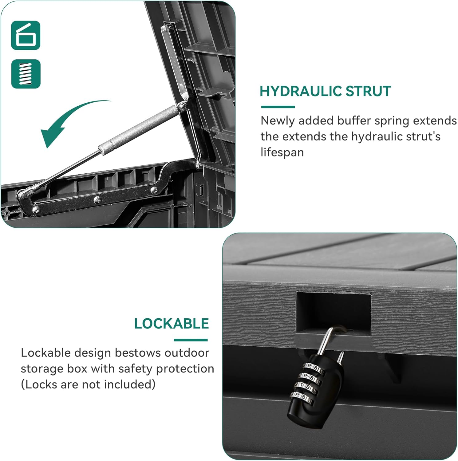 - Built to Last: Crafted from weather-resistant resin, these outdoor deck boxes are waterproof, rust-proof, UV-resistant, and fade-proof, making them ideal for long-term outdoor use in various climate conditions