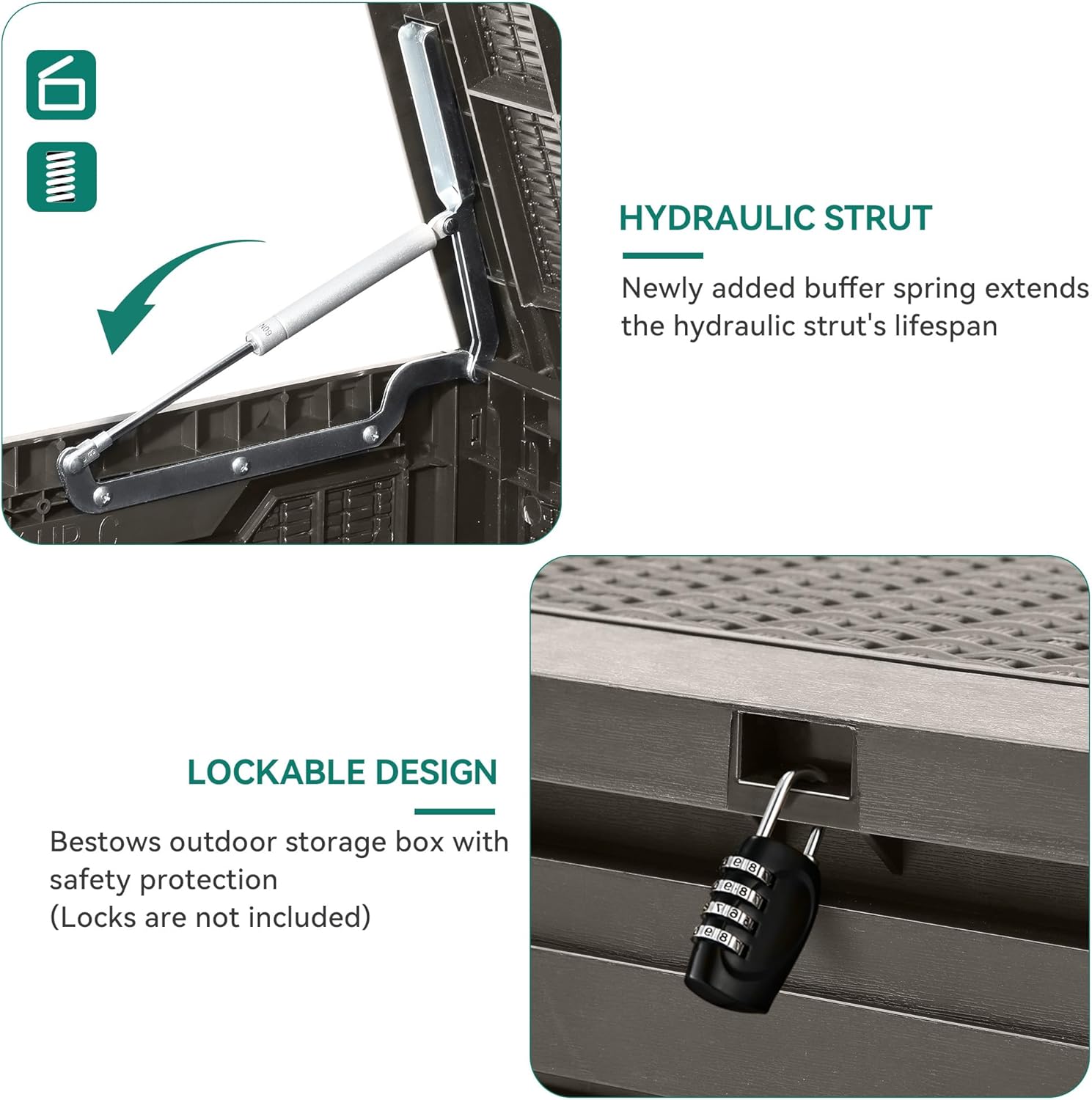 - Built to Last: Crafted from weather-resistant resin, these outdoor deck boxes are waterproof, rust-proof, UV-resistant, and fade-proof, making them ideal for long-term outdoor use in various climate conditions
