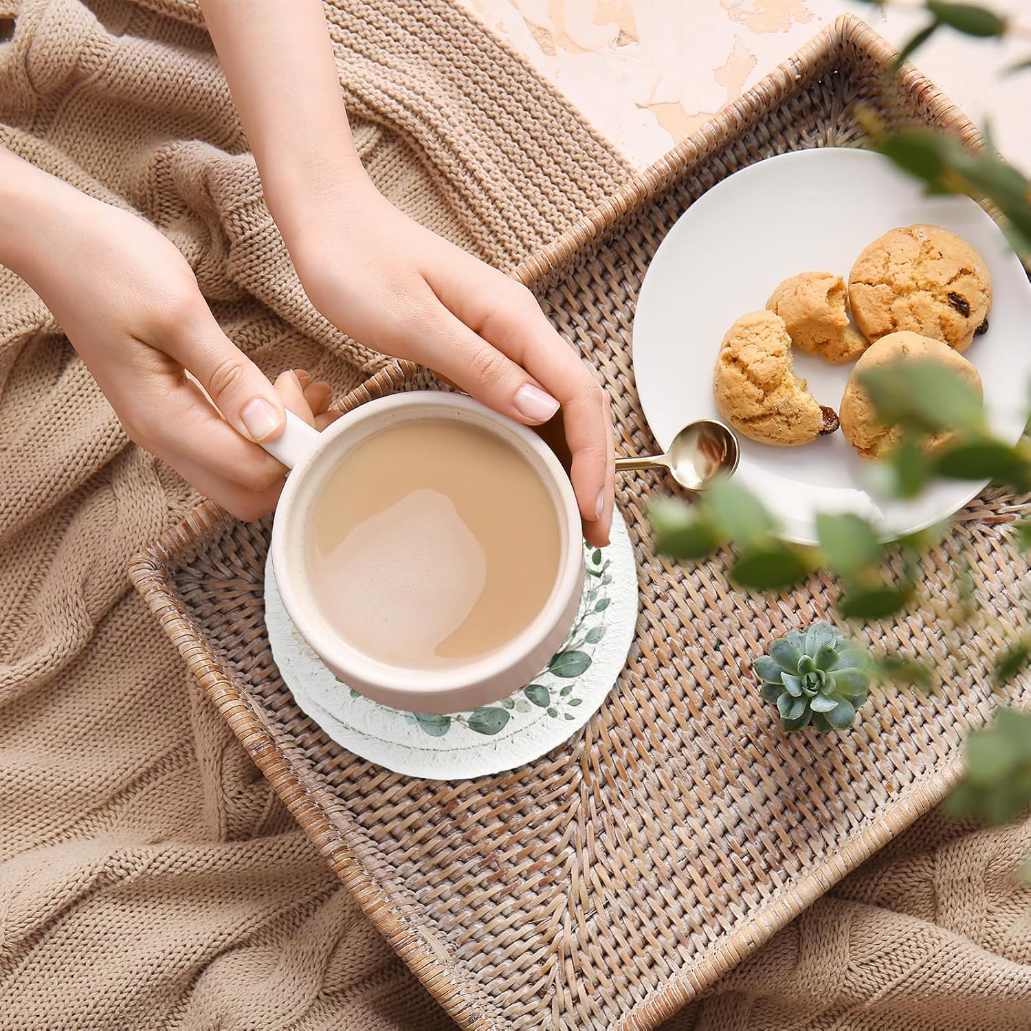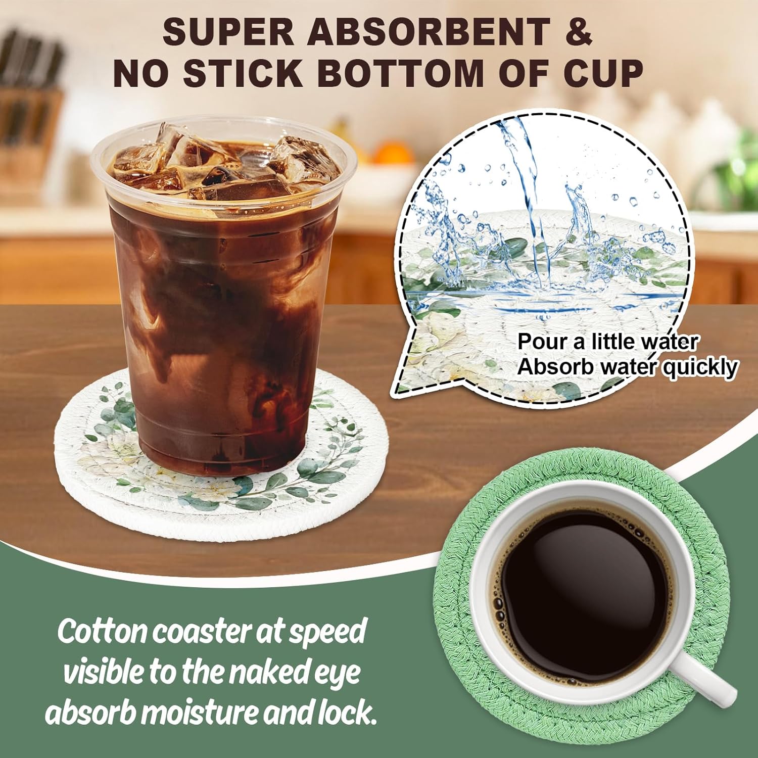 - Flowers & Leaves Design: Our braided cotton coasters are designed with eucalyptus leaves and flowers, mainly colored in green, elegant and delicate