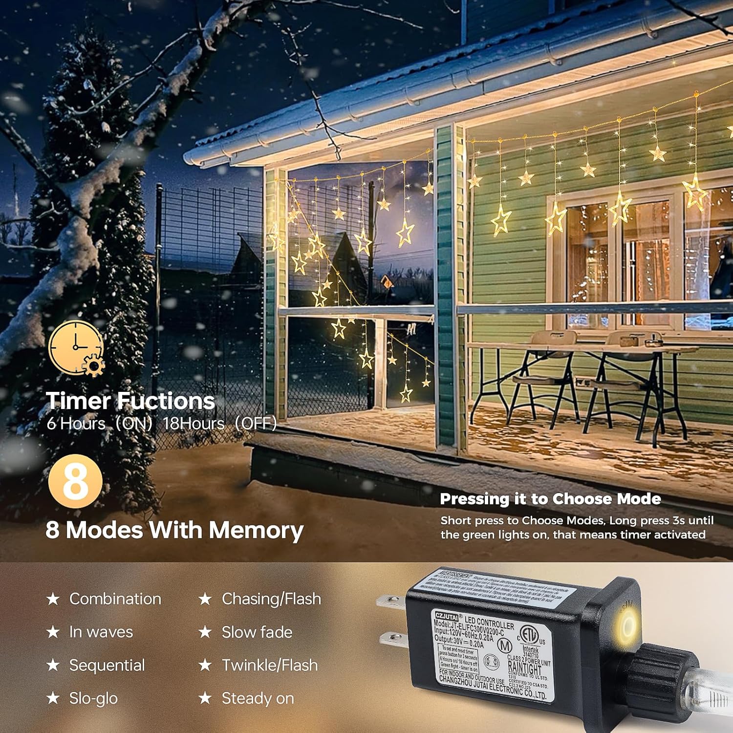 - 8 Lighting Modes with Memory & Timer:The star curtains lights have 8 lighting modes for you.Intelligent memory function design can remember your choice without having to reset the string lights every time. Also long press 3s until the green lights on, it means the timer is activated, the lights will 6 hours on and 18 hours off automatically.