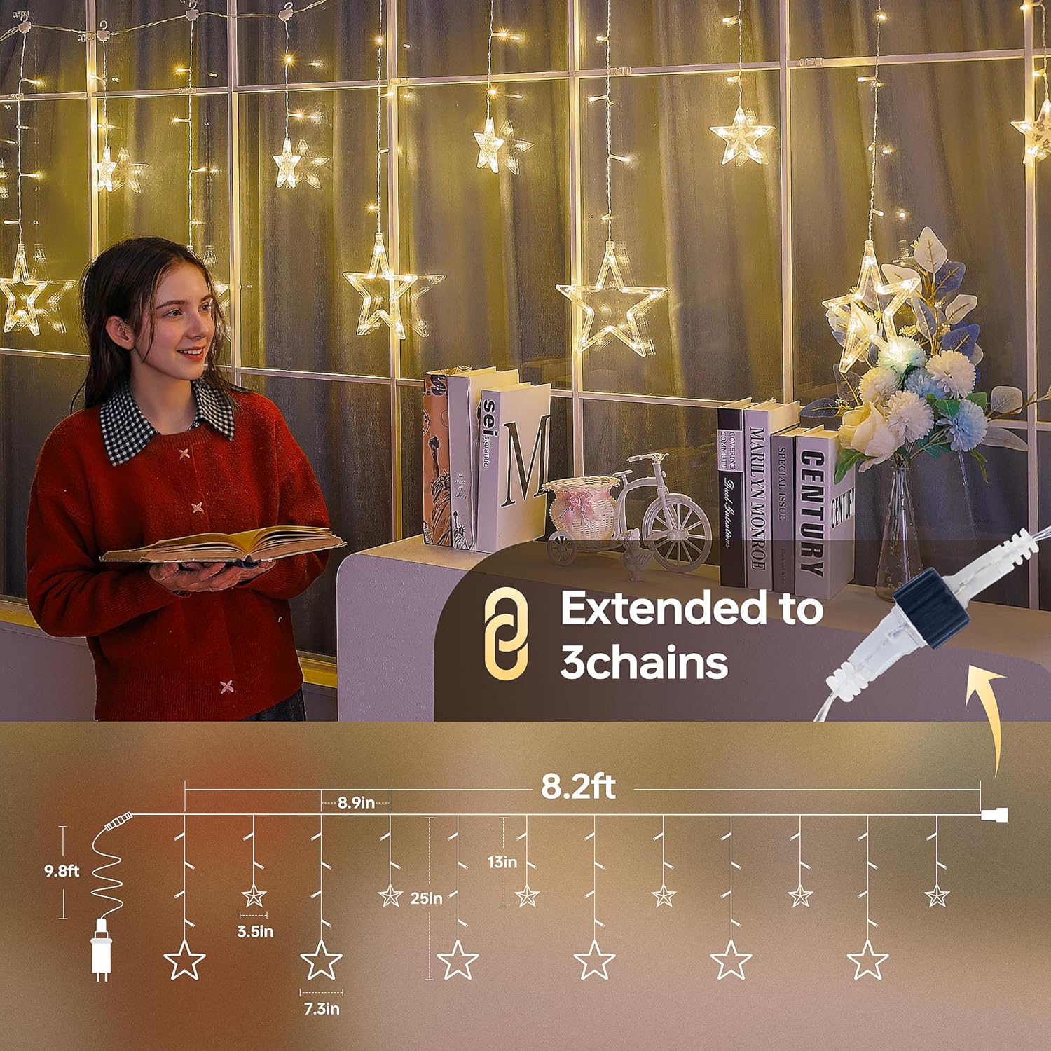 - Warm White Star Icicle Lights:MYGOTO 126 bright warm white LED Christmas curtain Lights with clear wire is 8.2 feet long.12 Stars (6 large +6 small), the diameter of the large star is 7.3inch,the small star is 3.5inch,which can create a warm festive atmosphere and make your home a wonderful sight for your neighbors.