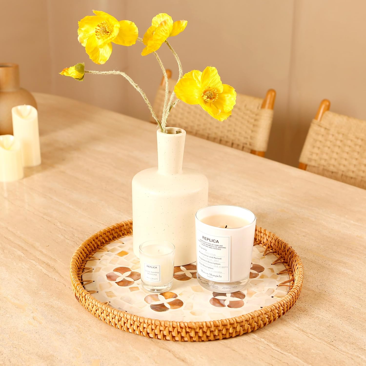 - Handwoven with Care: Each tray is carefully woven by skilled artisans, natural rattan texture and the subtle shine of seashells, reflecting a high level of craftsmanship and attention to detail
