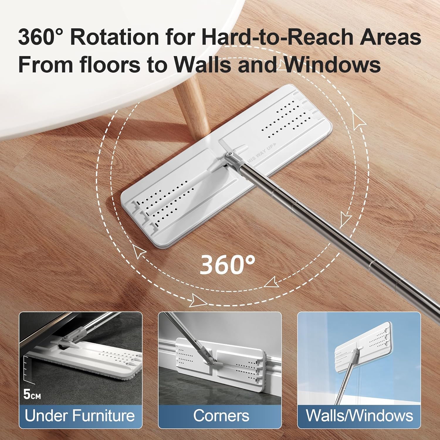 - [Extended Microfiber Mop] With 360°rotation and bigger mop head, the flat mop can reach to any corners, those "under-the-whatever" and more wider places for much faster cleaning job! The adjustable Stainless Steel Handles can be extended from 26.5 to 60.0 inches, great for wet dry mops or dust mops for wall cleaning