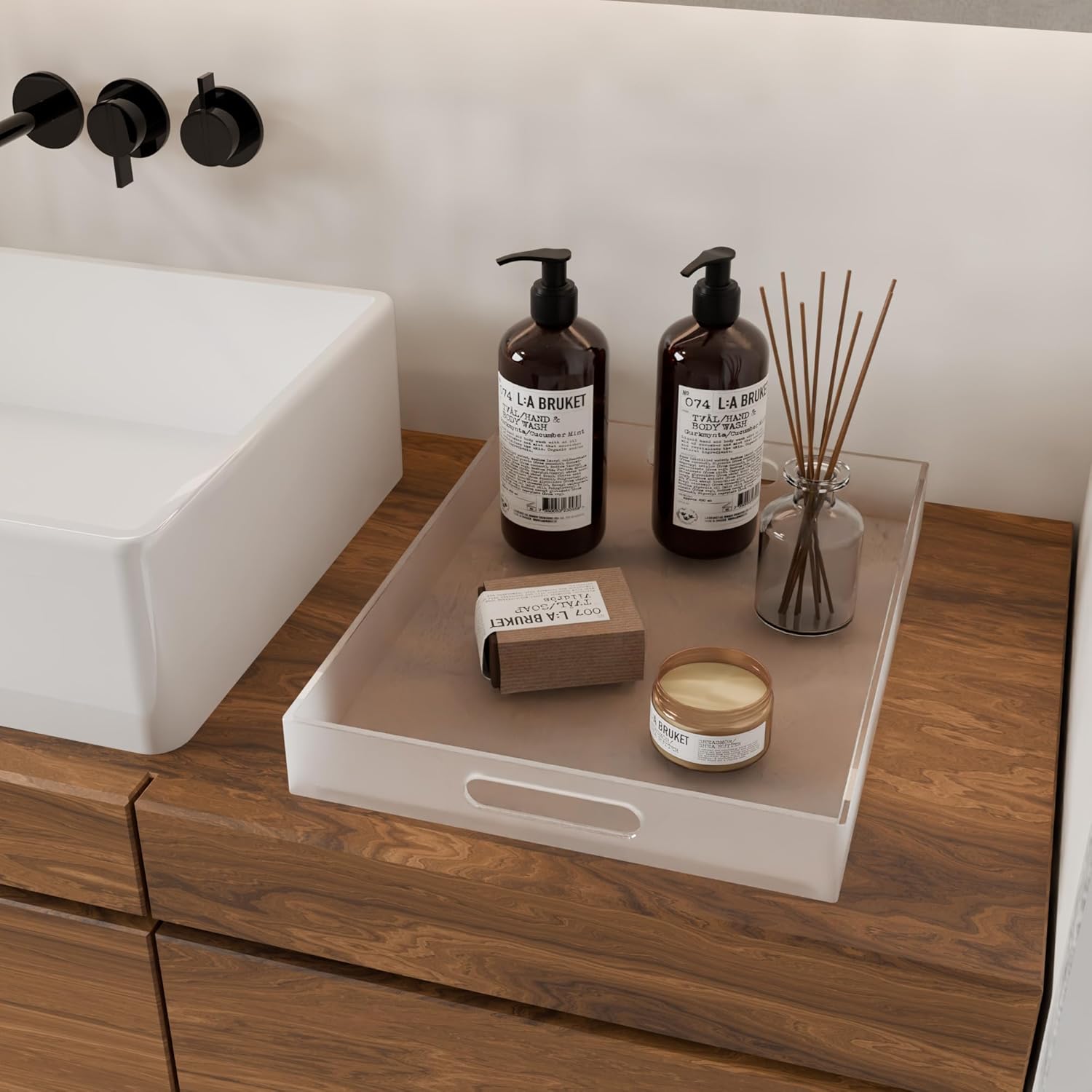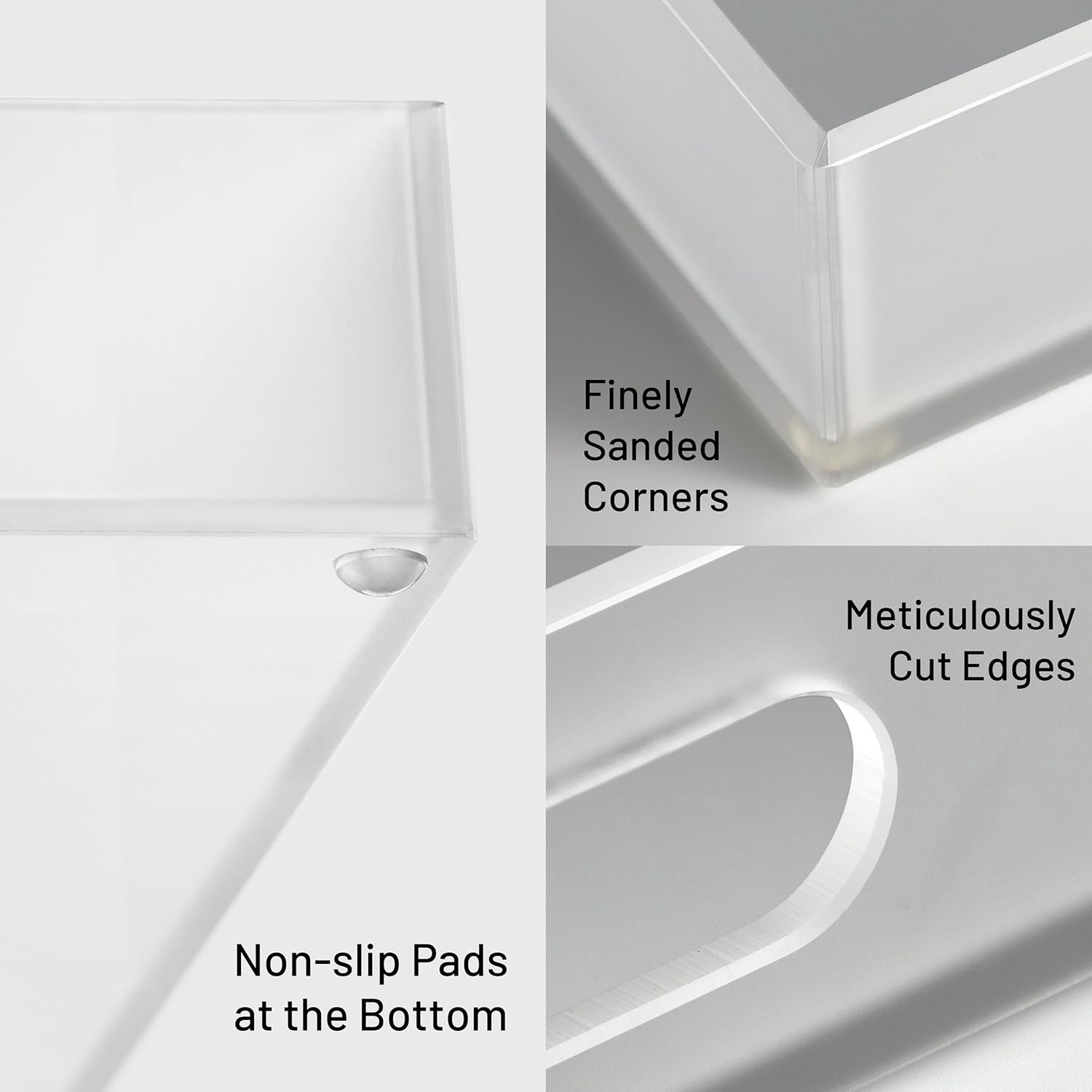 - SECURE & STABLE: Our acrylic tray is designed with silicone anti-slip pads to protect surfaces from scratches and provide stability. With these pads in place, the tray remains steady on various countertops, preventing any sliding or movement.