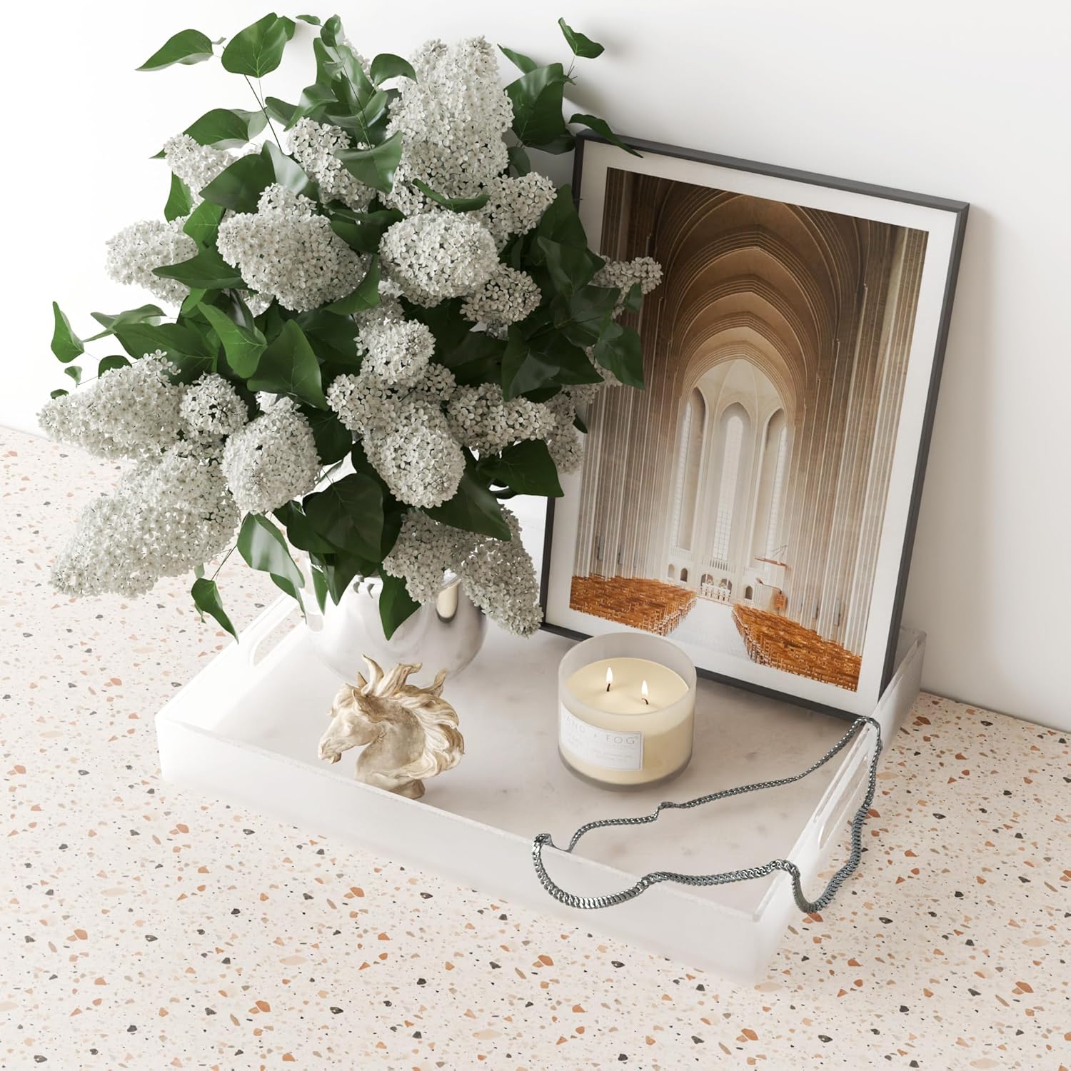 - MULTIPURPOSE ORGANIZER: Our tray can hold coffee, food, tea, fruit, snacks, appetizers, desserts, and drinks at the bar, kitchen, or party according to your needs. Additionally, it can also function as a vanity tray for bathroom, counter, or dresser tops while doubling up as an organizer for remote controls, magazines, makeup, toiletries, and more. Its adaptable design makes it a suitable addition to kitchens, bathrooms, vanity areas, and bars.