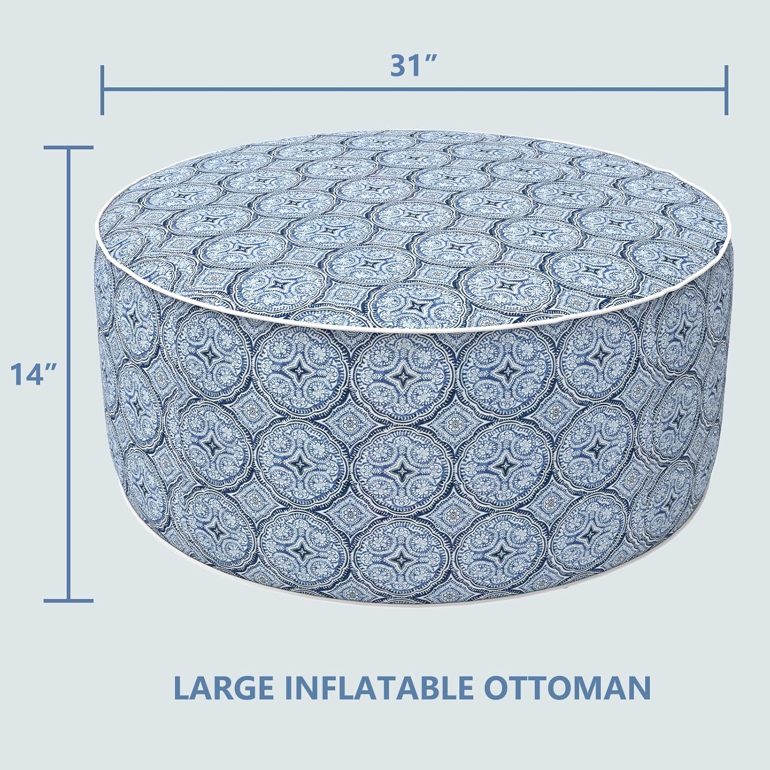 LVTXIII Outdoor Inflatable Ottoman, Fade-Resistant Round Footrest Stool D31”x H14”, Portable Patio Pouf for Garden Camping or Home Use, Medallion Blue