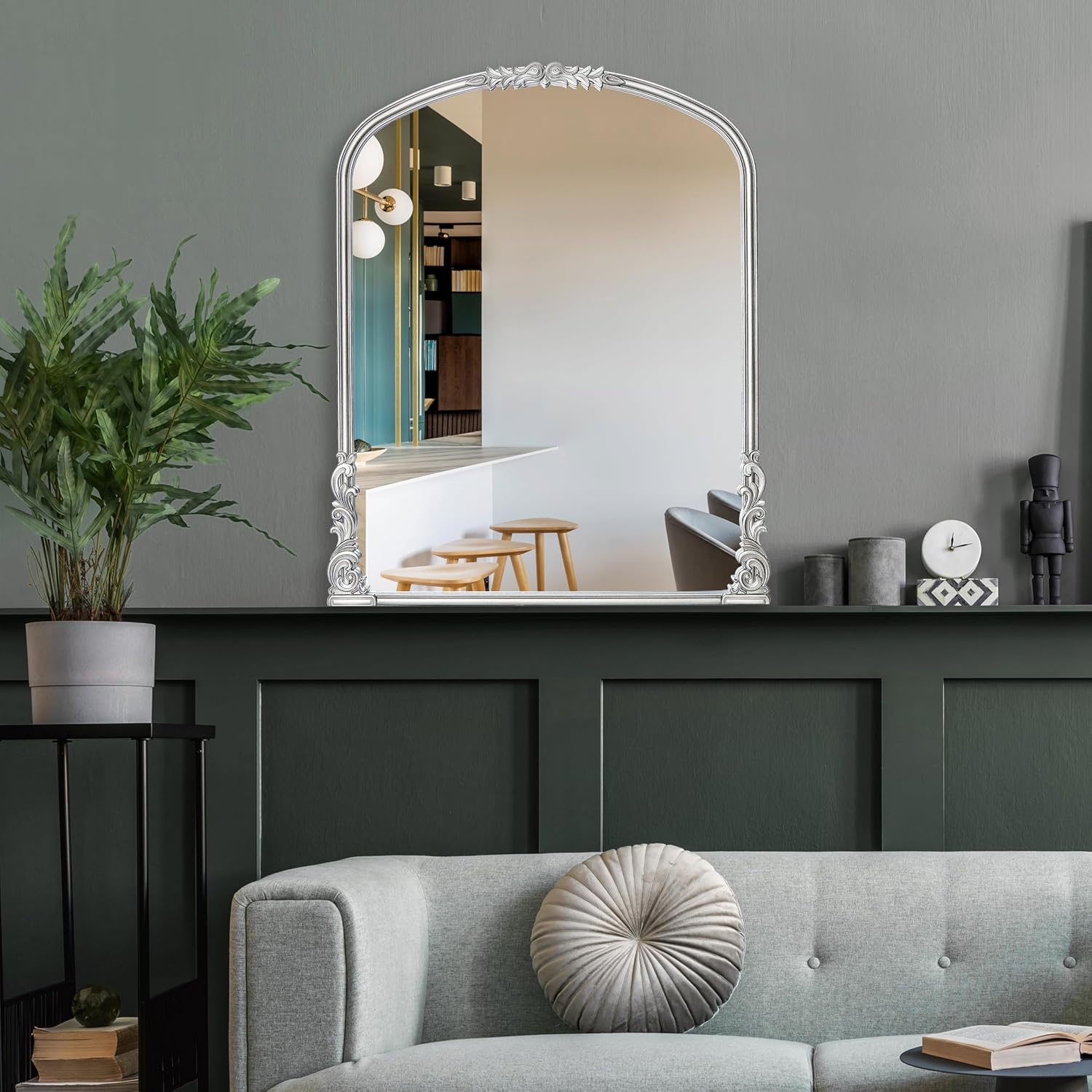 English Estate Carved Arch Wood Wall Mirror, Mirror for Entryway, Living Room, Bathroom, Antique Silver, 25.6x33.4
