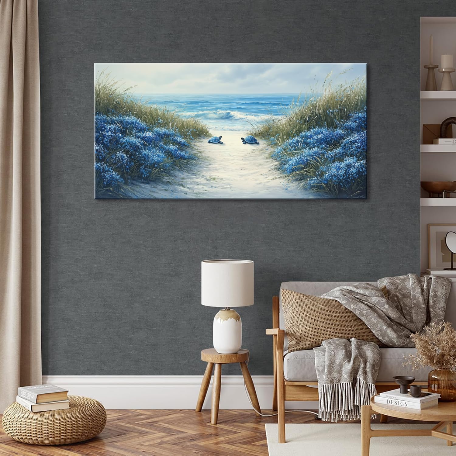 LASMOND Romantic Beach Wall Art for Living Room Blue Sea Turtle Lovers Canvas Painting Prints Ocean Sandy Romance Flowers Large Bedroom Office Decor Artwork (46x23 Inches)