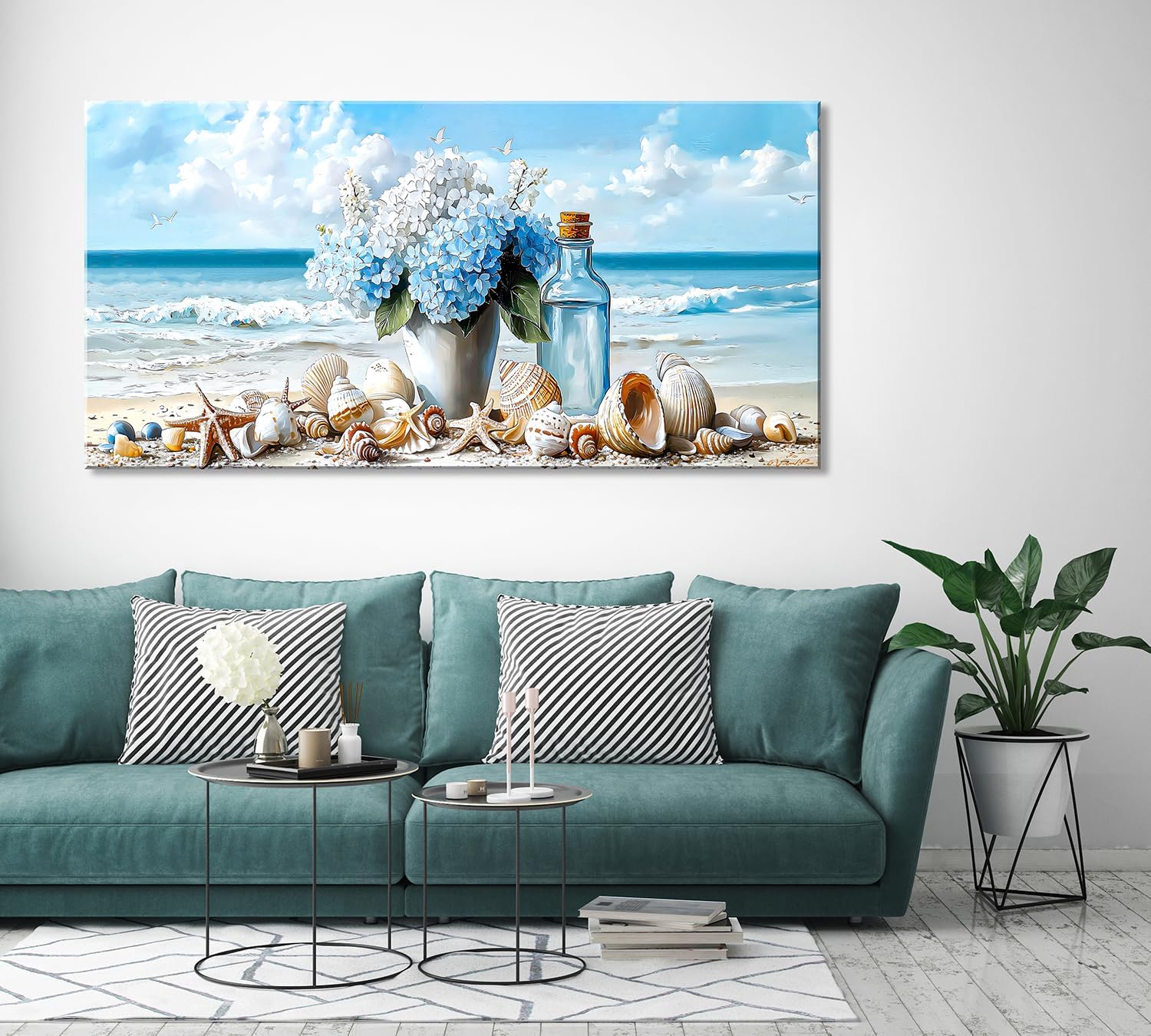 LASMOND Romantic Beach Wall Art for Living Room Blue Shells Conch Vase Canvas Prints Modern Large Flower Bottle Bedroom Ocean Artwork Decor (40x20 Inches)