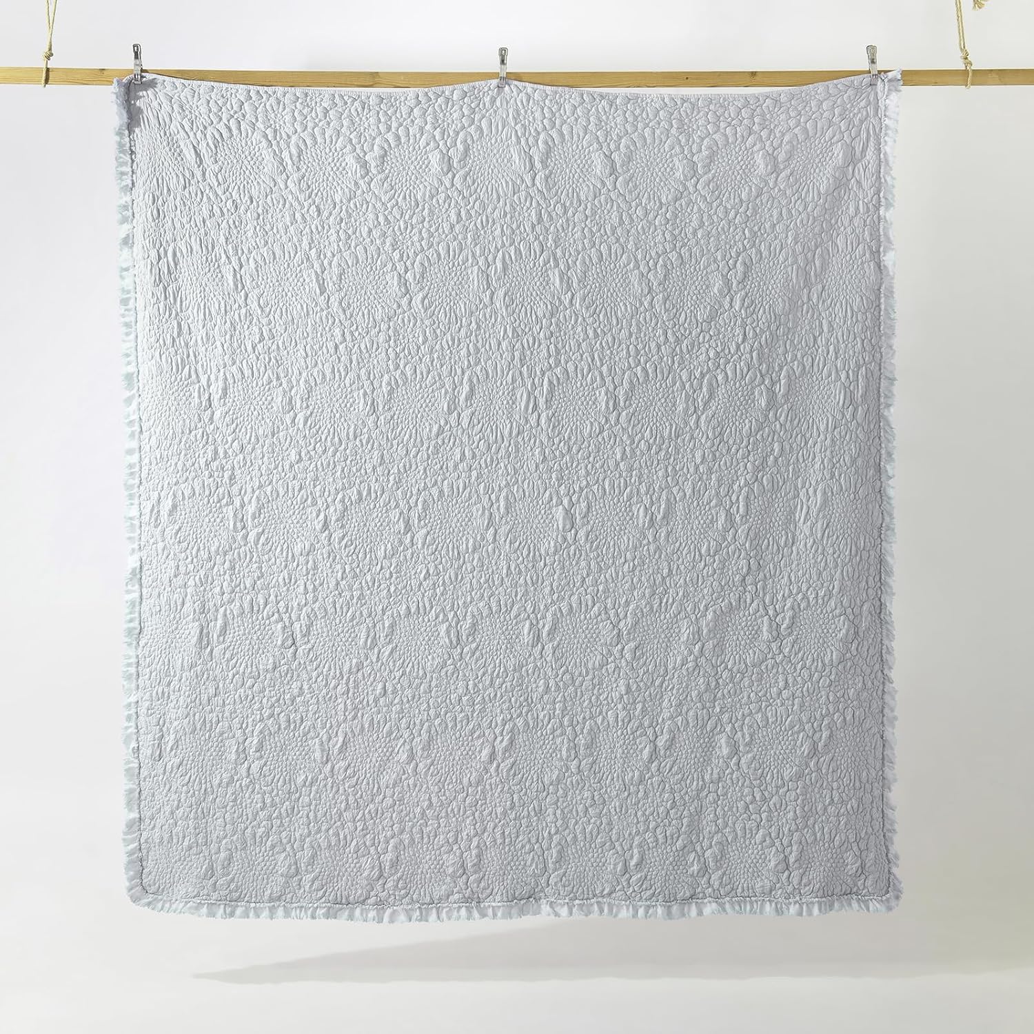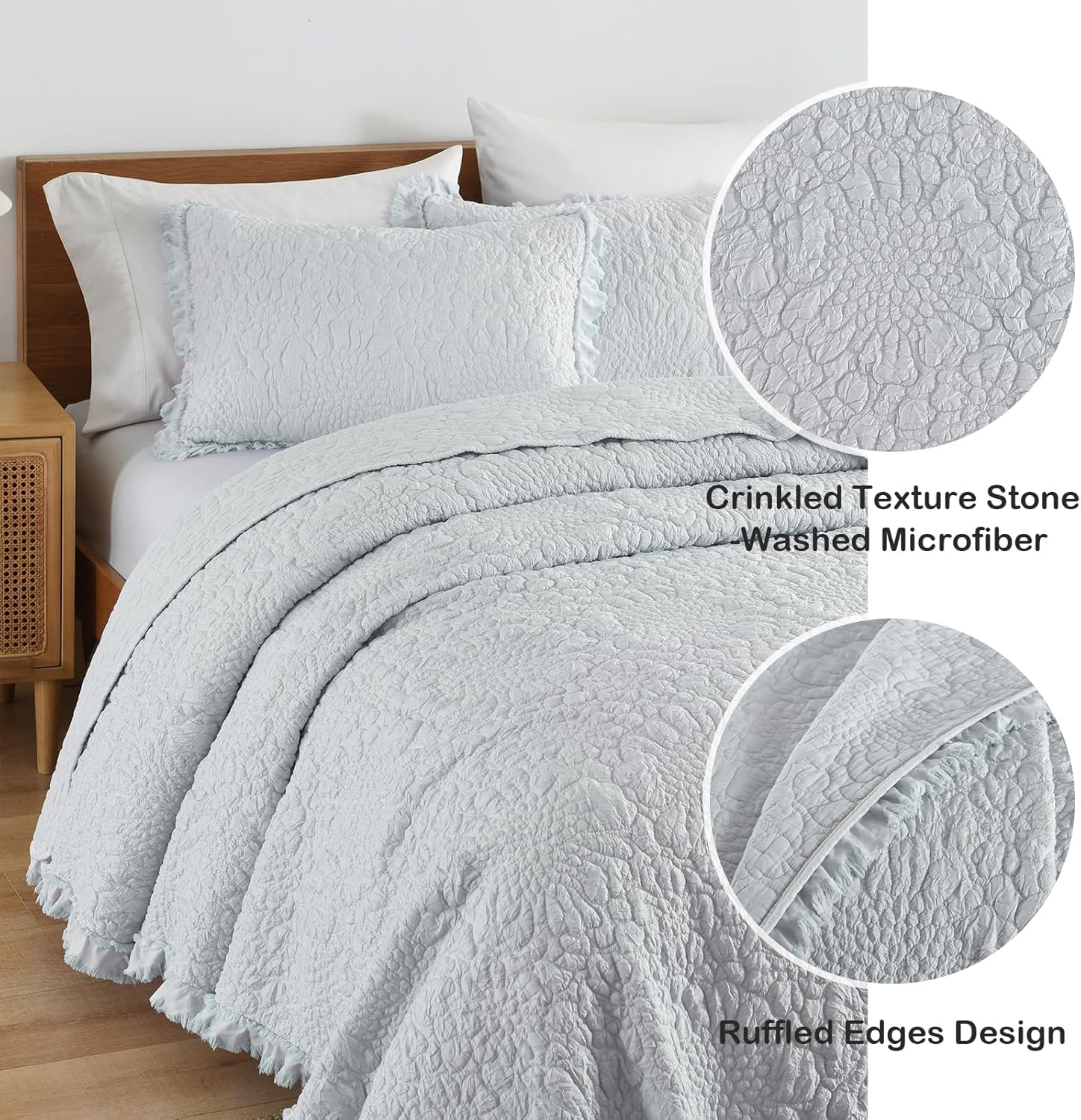 Light Blue Ruffled Quilt King Size, Stone-Washed Microfiber Lightweight Crinkled Farmhouse Rustic Shabby Chic Bedding Set, 3 Pieces Reversible Bedspread Coverlet with Pillow Shams for All Season