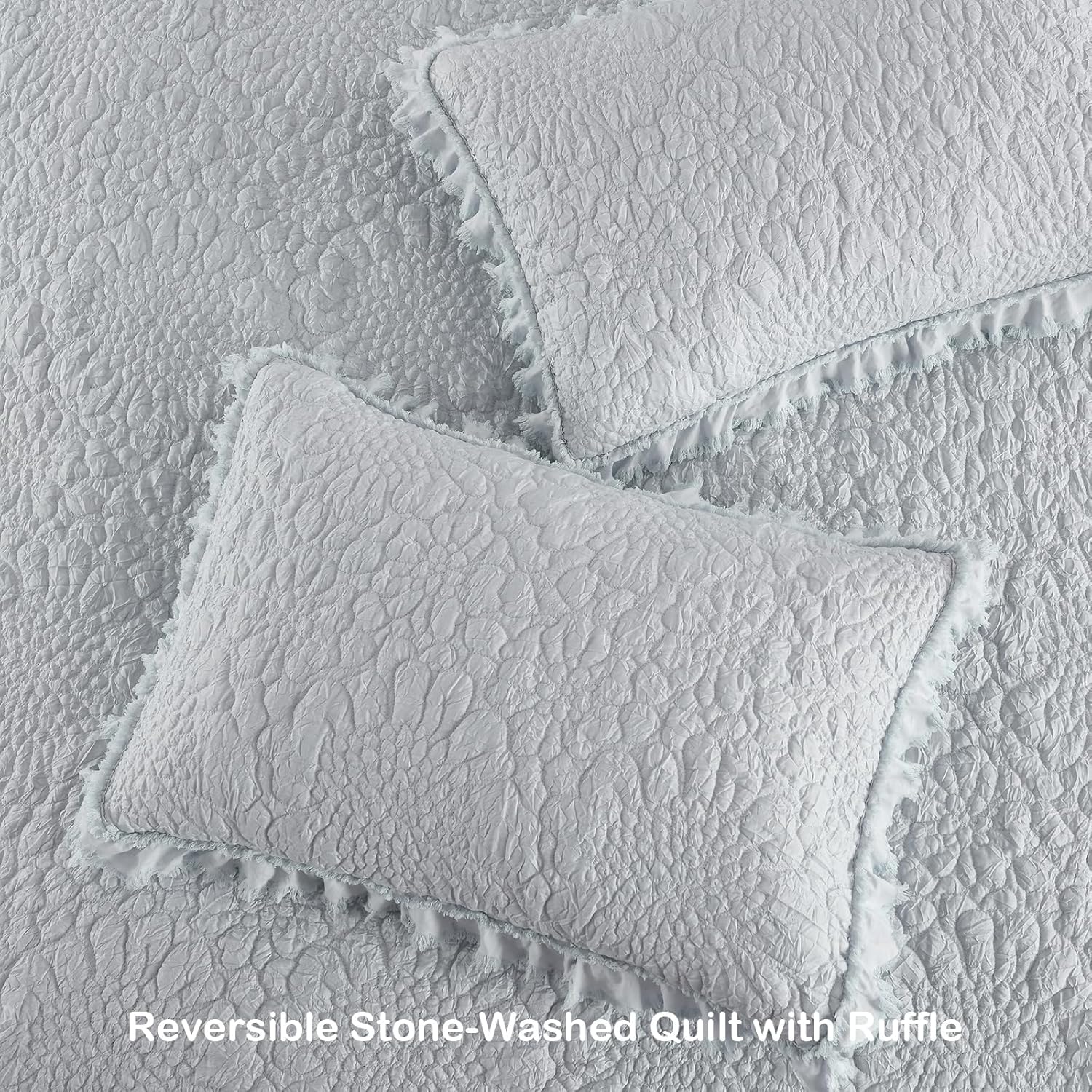 Light Blue Ruffled Quilt Queen Size, Stone-Washed Microfiber Lightweight Crinkled Farmhouse Rustic Shabby Chic Bedding Set, 3 Pieces Reversible Bedspread Coverlet with Pillow Shams for All Season