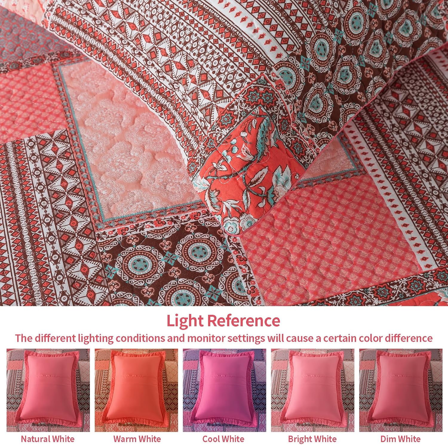 - 【Easy to Care】Pink quilts queen size are machine-washable. No color fading and no unraveling after washing. A full size quilt can be washed by a gentle water cycle and tumbled dry at low heat. Do not bleach. When received floral quilt, it is vacuum packed, washing will make it softer and fluffier.