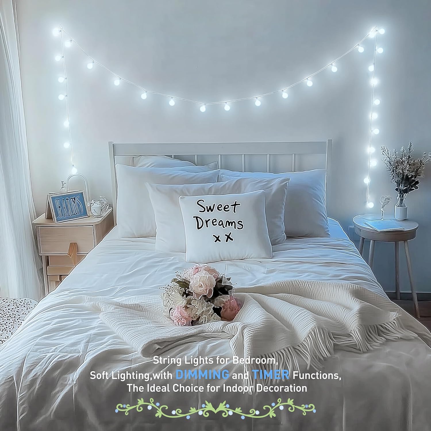 - 【Globe String Lights】The white Led string lights come with frosted globes can create a soft, cosy light to take care of your eyes. So the lighting effect of the frosted ball is irreplaceable by other LED string lights. The cute string lights indoor provide a fun feel for room aesthetic to the bedroom, dorm, classroom, living room. The globe around the lights are shatterproof, it create a unique relaxing and soothing indoor atmosphere, and enhances the durability of the string lights