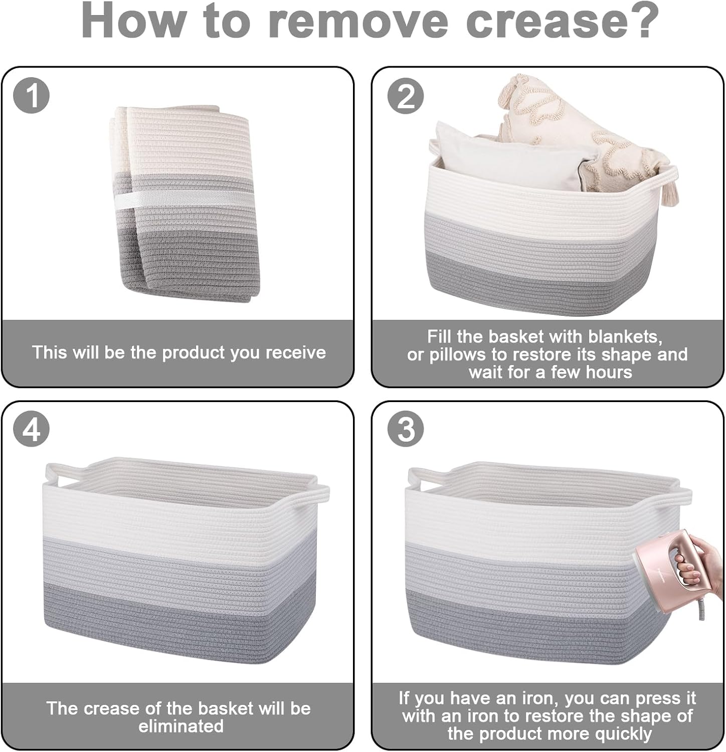 - NOTE: The toy basket is folded, but it will turn back to its elegant shape quickly if you fill it with some pillows or blankets, and iron is great idea to remove the creases