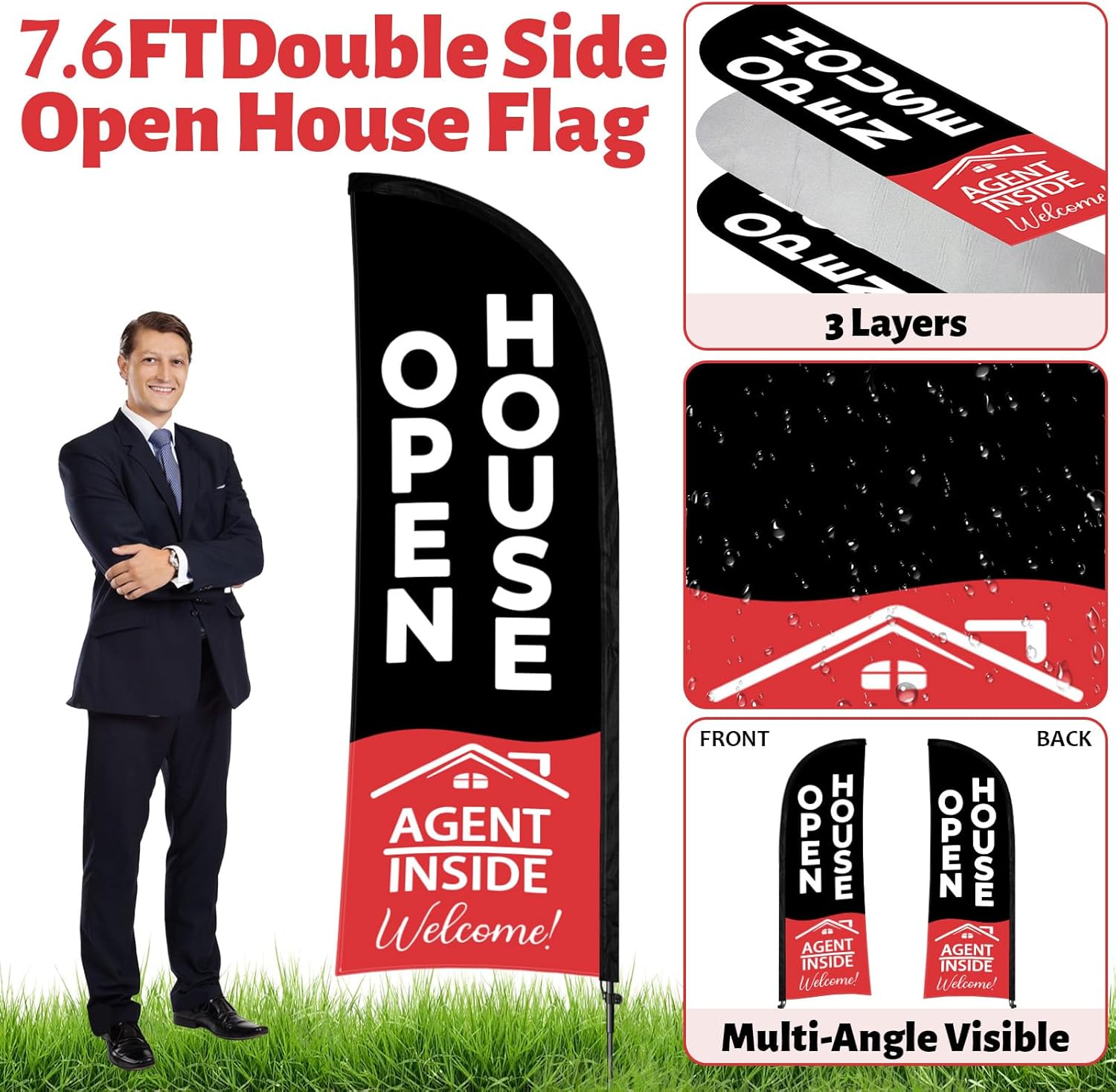 - Double-Sided Printing: Made of premium aluminum and fiberglass flagpole. Double-sided flag and signs with bold and clear fonts to convey the information of house for sale in multiple ways and angles. With thickness design, used in wind or rain. For real estate agent and home for sale by owner to increase foot traffic